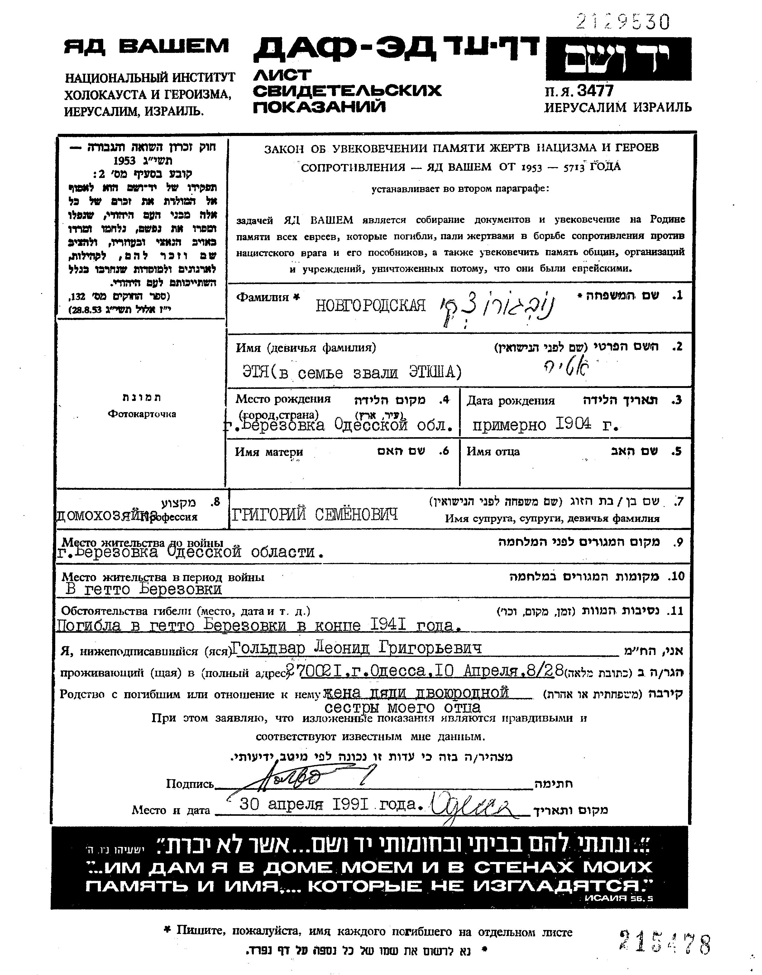 Etia Novgorodski נולדה בBerezovka שבאוקראינה (ברה"מ) בשנת 1904. היא היתה עקרת בית ונשואה לגריגורי. לפני מלחמת העולם השניה התגוררה בBerezovka שבאוקראינה (ברה"מ). בזמן המלחמה היא היתה בBerezovka שבאוקראינה (ברה"מ).