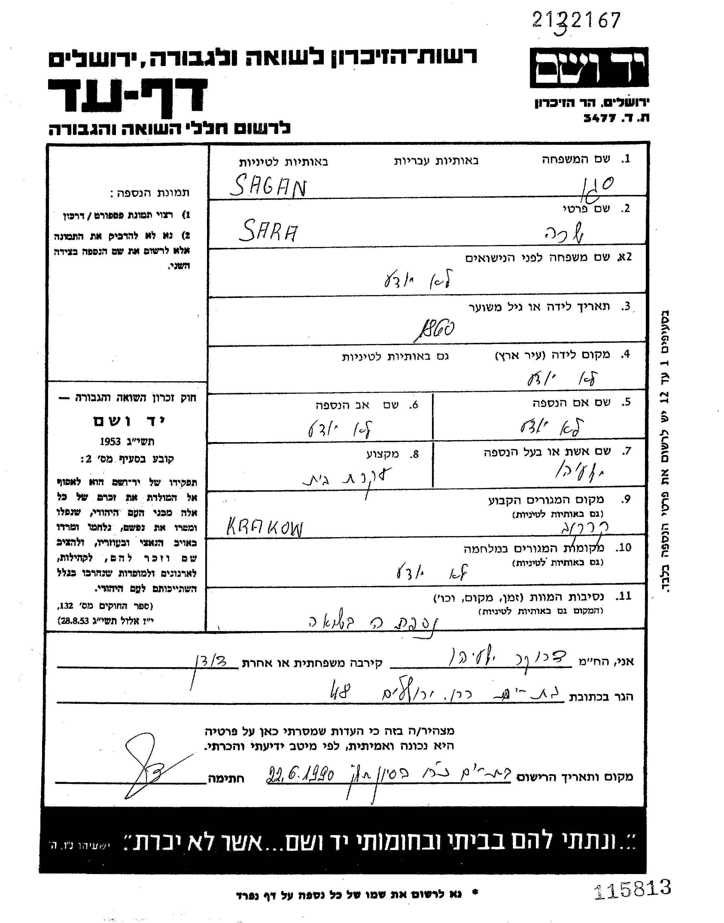 שרה סגן. היא היתה עקרת בית ונשואה לJeshajahu. לפני מלחמת העולם השניה התגוררה בKrakow שבפולין.