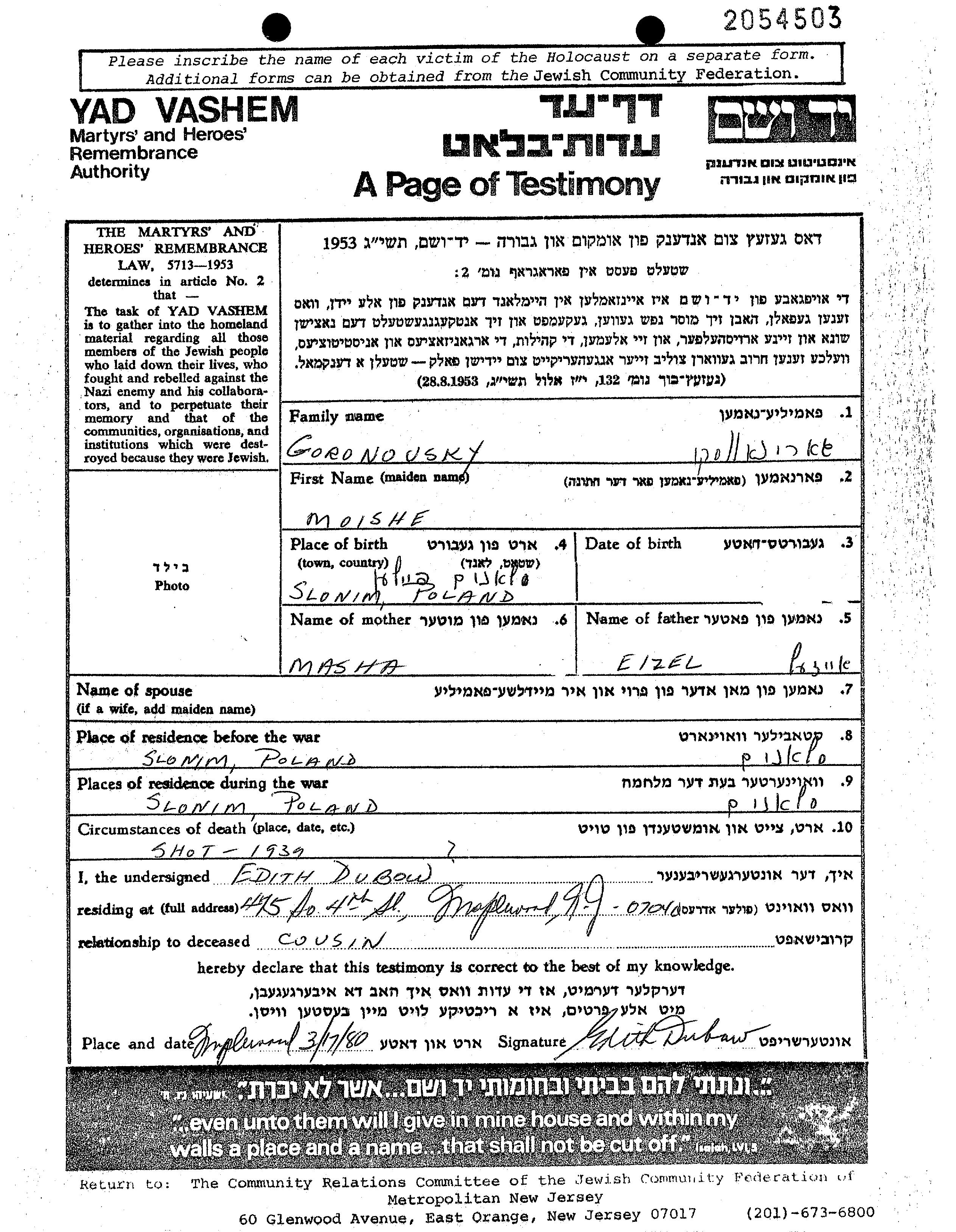 Moishe Goronovsky נולד בSlonim שבפולין לEizel ומאשה לבית Pletter פלטר. לפני מלחמת העולם השניה התגורר בSlonim שבפולין. בזמן המלחמה הוא היה בSlonim שבפולין.