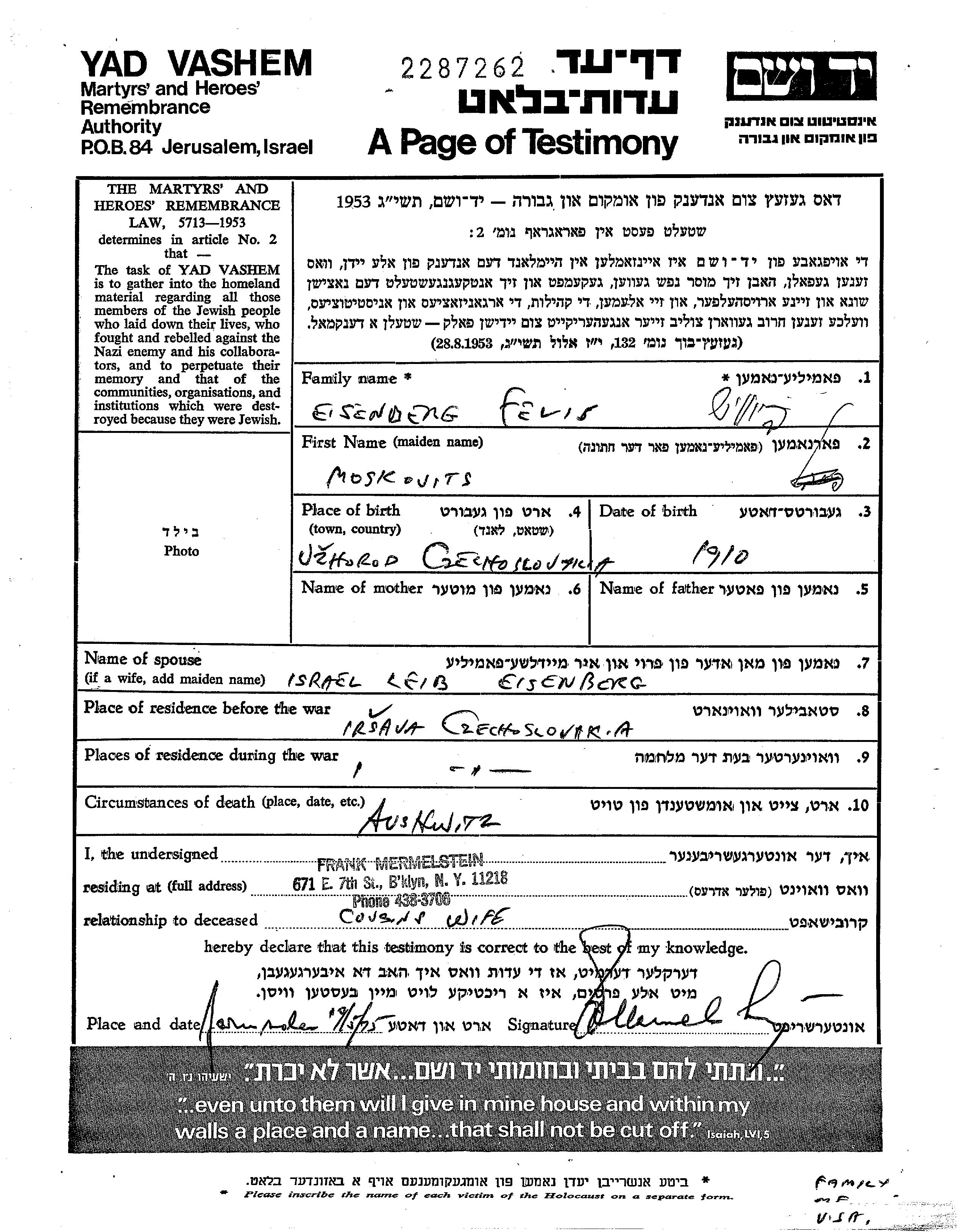 Fevis Eisenberg נולד בUzhorod שבצ'כוסלובקיה בשנת 1910. הוא היה נשוי לIsrael לייב לבית Moskovits. לפני מלחמת העולם השניה התגורר בIrsava שבצ'כוסלובקיה. בזמן המלחמה הוא היה בIrsava שבצ'כוסלובקיה.
