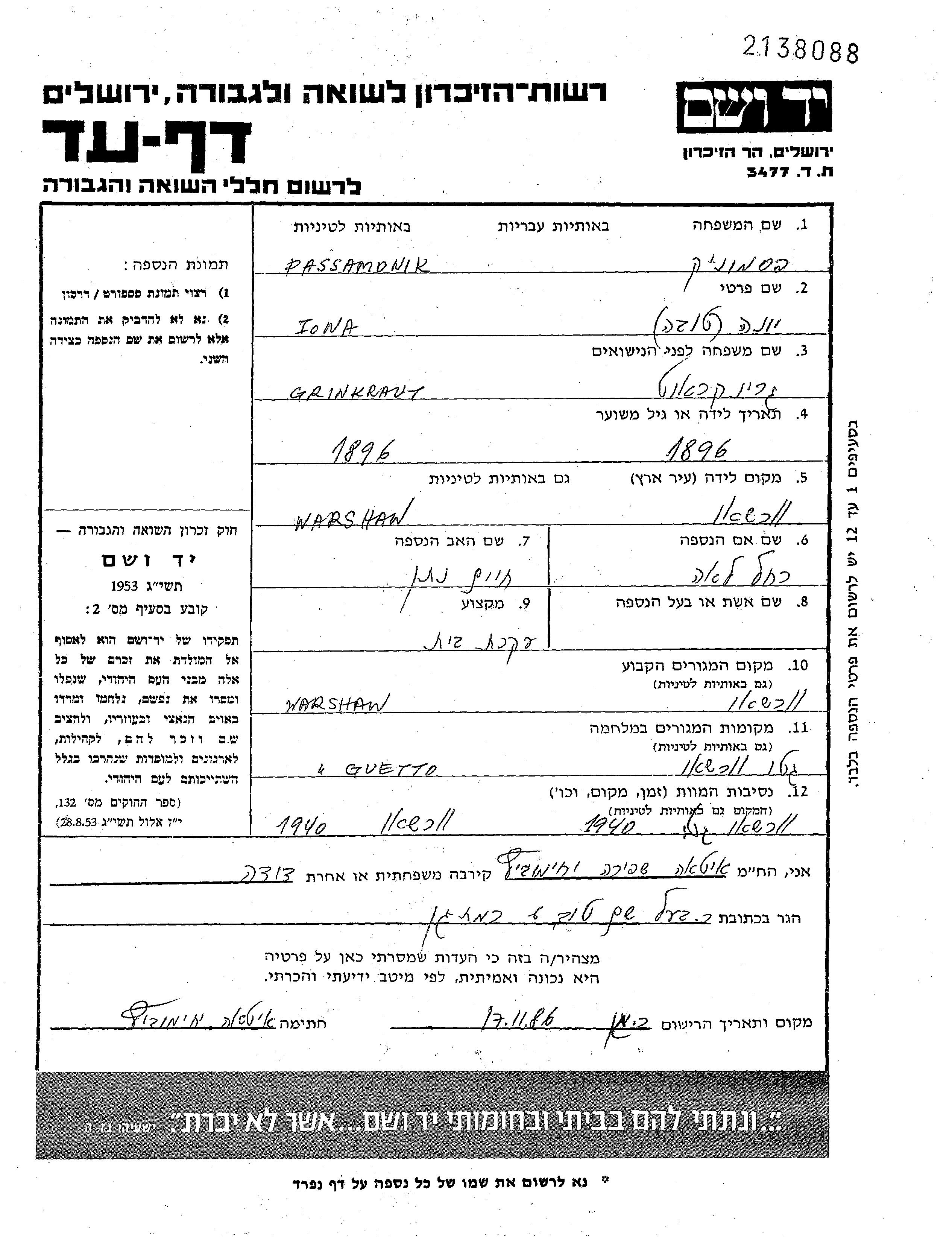 יונה טובה Passamonik לבית גרינקראוט נולדה בWarszawa שבפולין לחיים נתן ורחל לאה. היא היתה עקרת בית. לפני מלחמת העולם השניה התגוררה בWarszawa שבפולין. בזמן המלחמה היא היתה בWarszawa שבפולין.