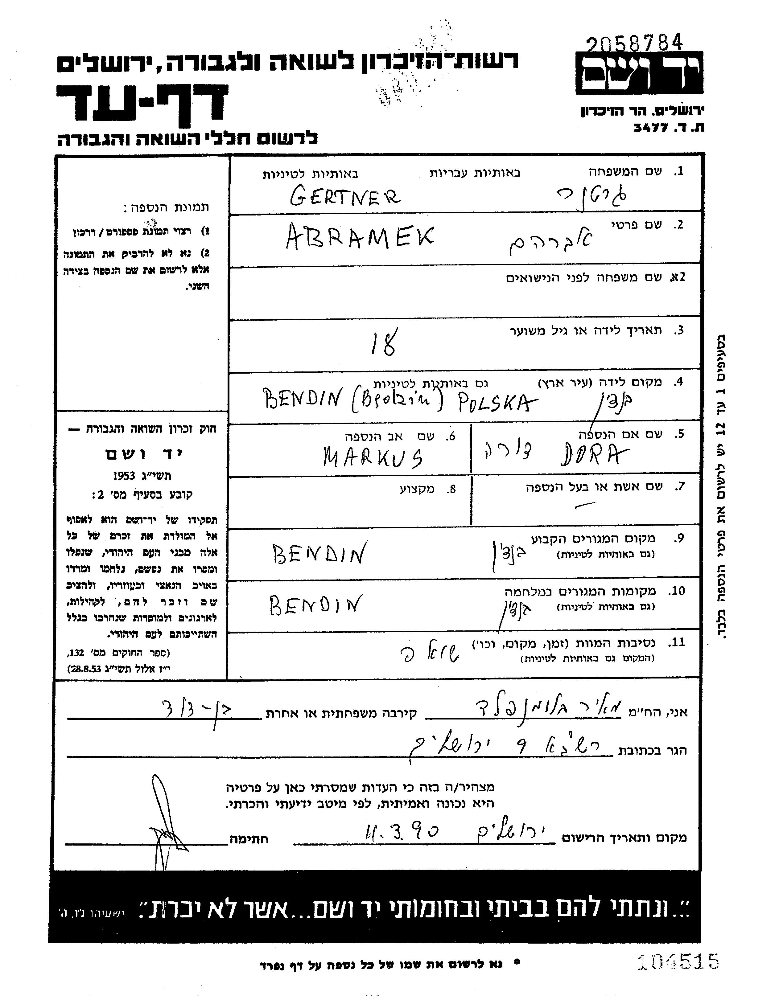 Abramek גרטנר נולד בBędzin שבפולין למרקוס ודורה לבית אייזנמן. לפני מלחמת העולם השניה התגורר בBędzin שבפולין. בזמן המלחמה הוא היה בBędzin שבפולין.