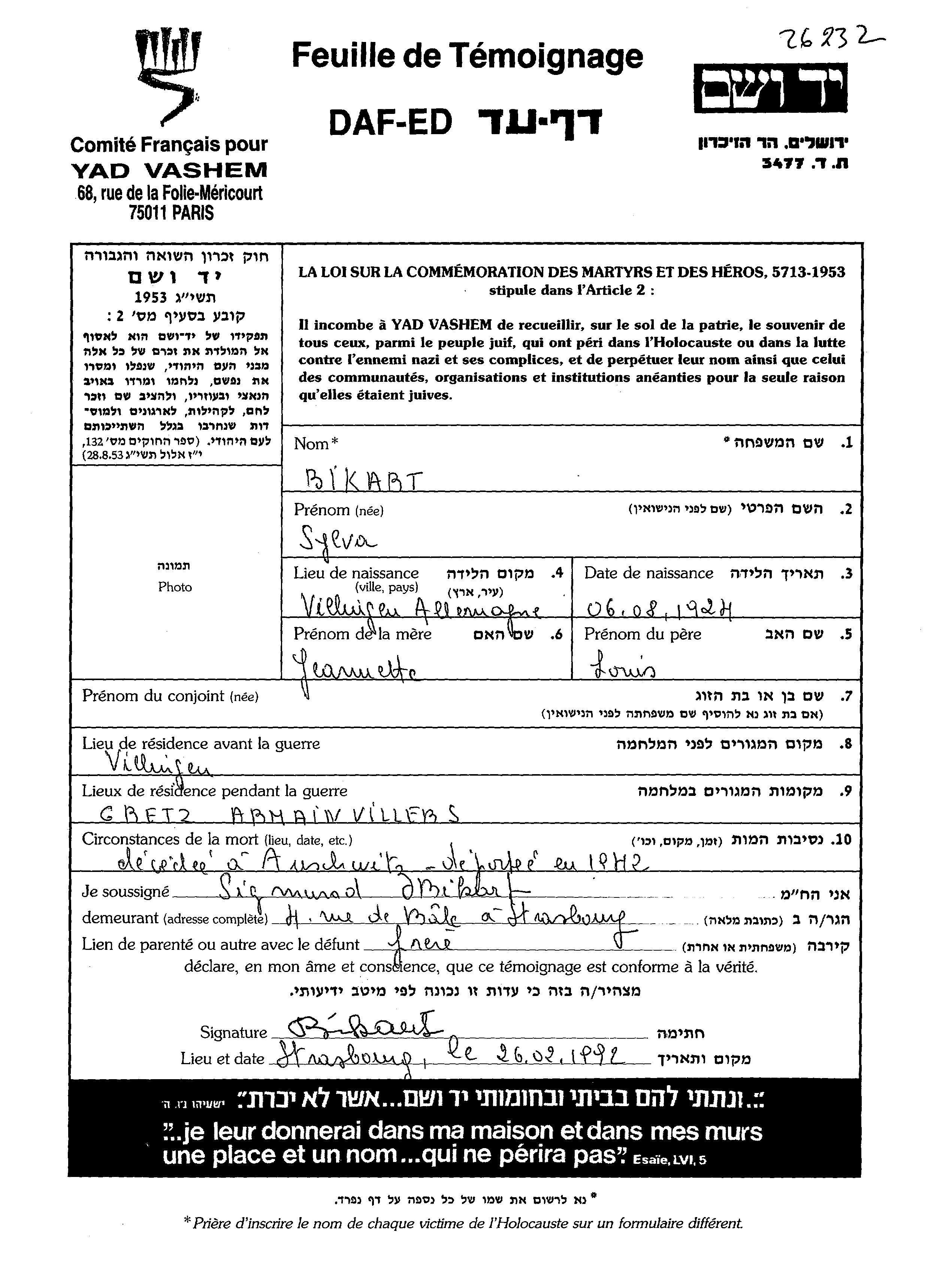 Sylva Bikart ביקרט נולדה בVillingen שבגרמניה בשנת 1924 לLouis וJeannette לבית Guggenheim. לפני מלחמת העולם השניה התגוררה בVillingen שבגרמניה. בזמן המלחמה היא היתה בGretz Armainvilliers שבצרפת. היא נרצחה בשואה. מקום המוות: Auschwitz שבפולין בשנת 1942.