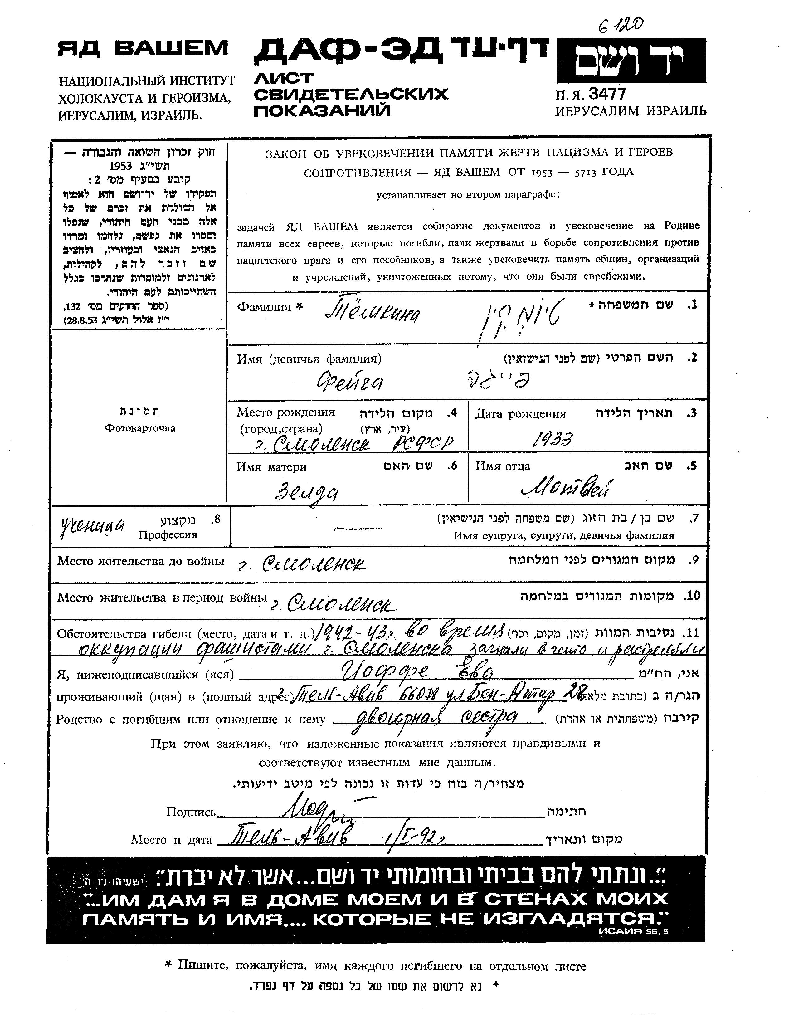 פייגה נרצחה בשואה. מקום המוות: Smolensk שברוסיה (ברה"מ) בשנת 1942.