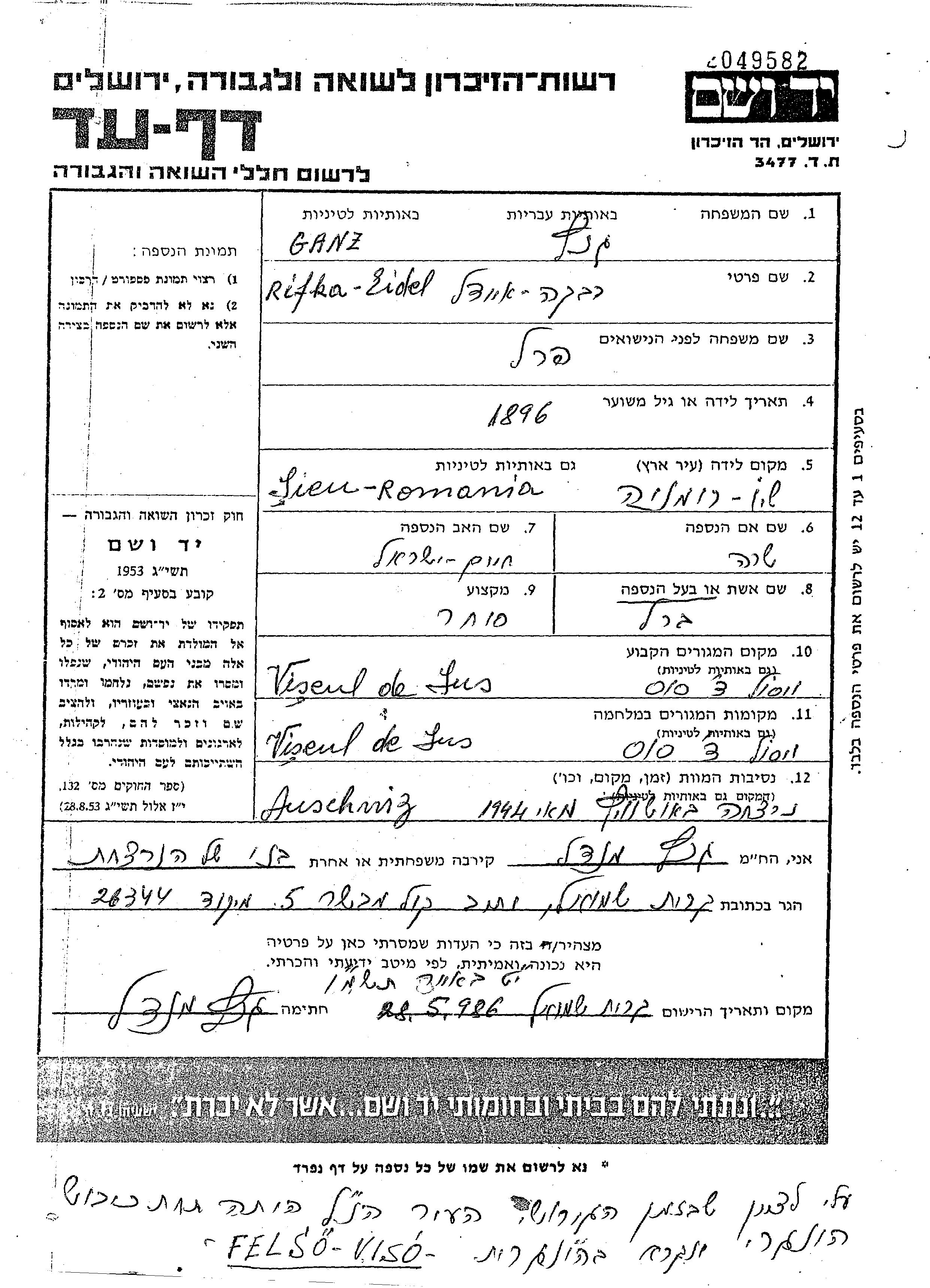ריפקה איידל גנז לבית פרל נולדה בSieu שברומניה בשנת 1896 לחיים Israel ושרה. היא היתה סוחרת ונשואה לBerl. לפני מלחמת העולם השניה התגוררה בViseul de Sus שברומניה. בזמן המלחמה היא היתה בViseul de Sus שברומניה. ריפקה איידל נרצחה בשואה. מקום המוות: Auschwitz שבפולין בשנת 1944.