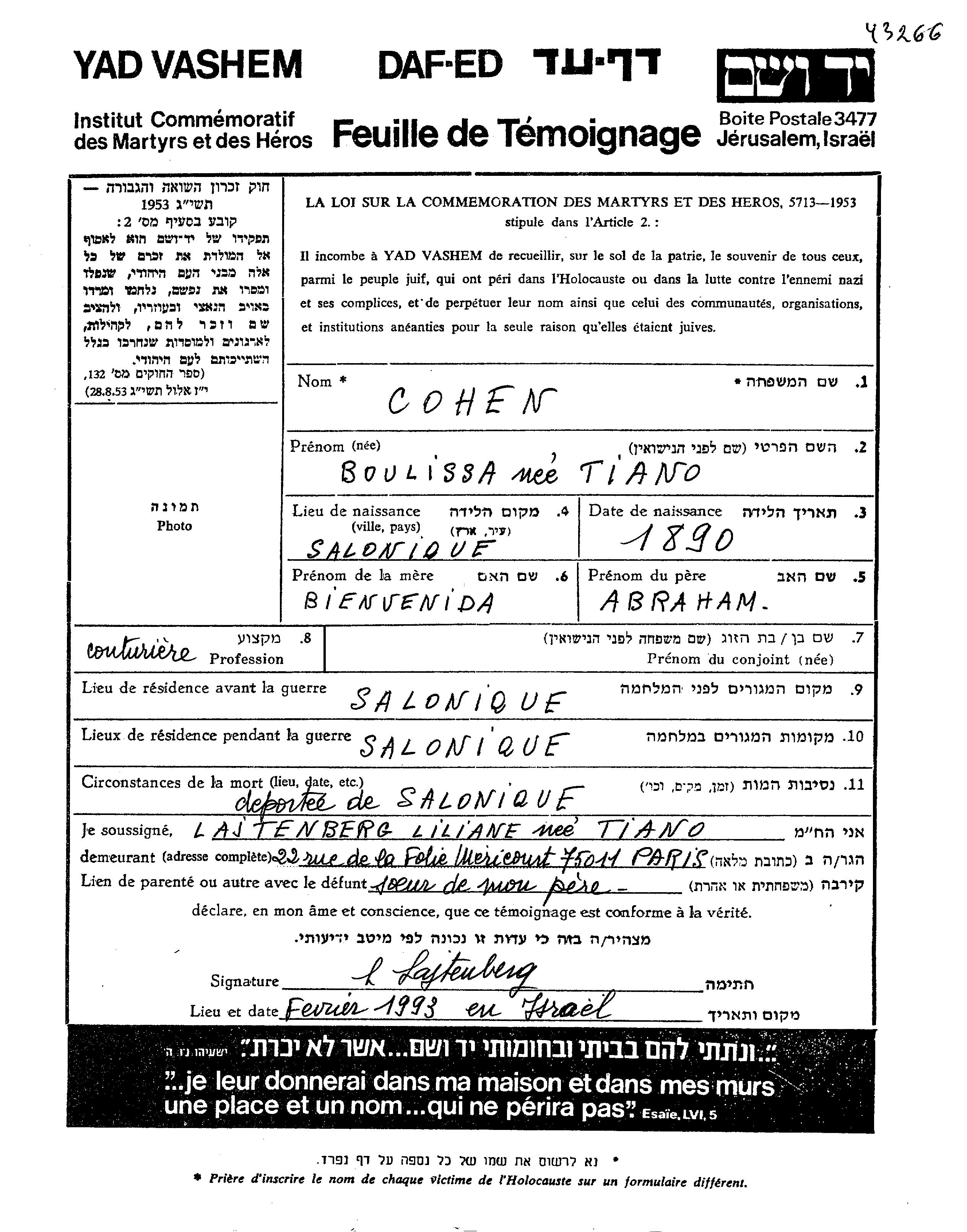 Boulissa Cohen לבית טיאנו נולדה בSaloniki שביון בשנת 1890 לAbraham וביאנוונידה. היא היתה תופרת ונשואה. לפני מלחמת העולם השניה התגוררה בSaloniki שביון. בזמן המלחמה היא היתה בSaloniki שביון.