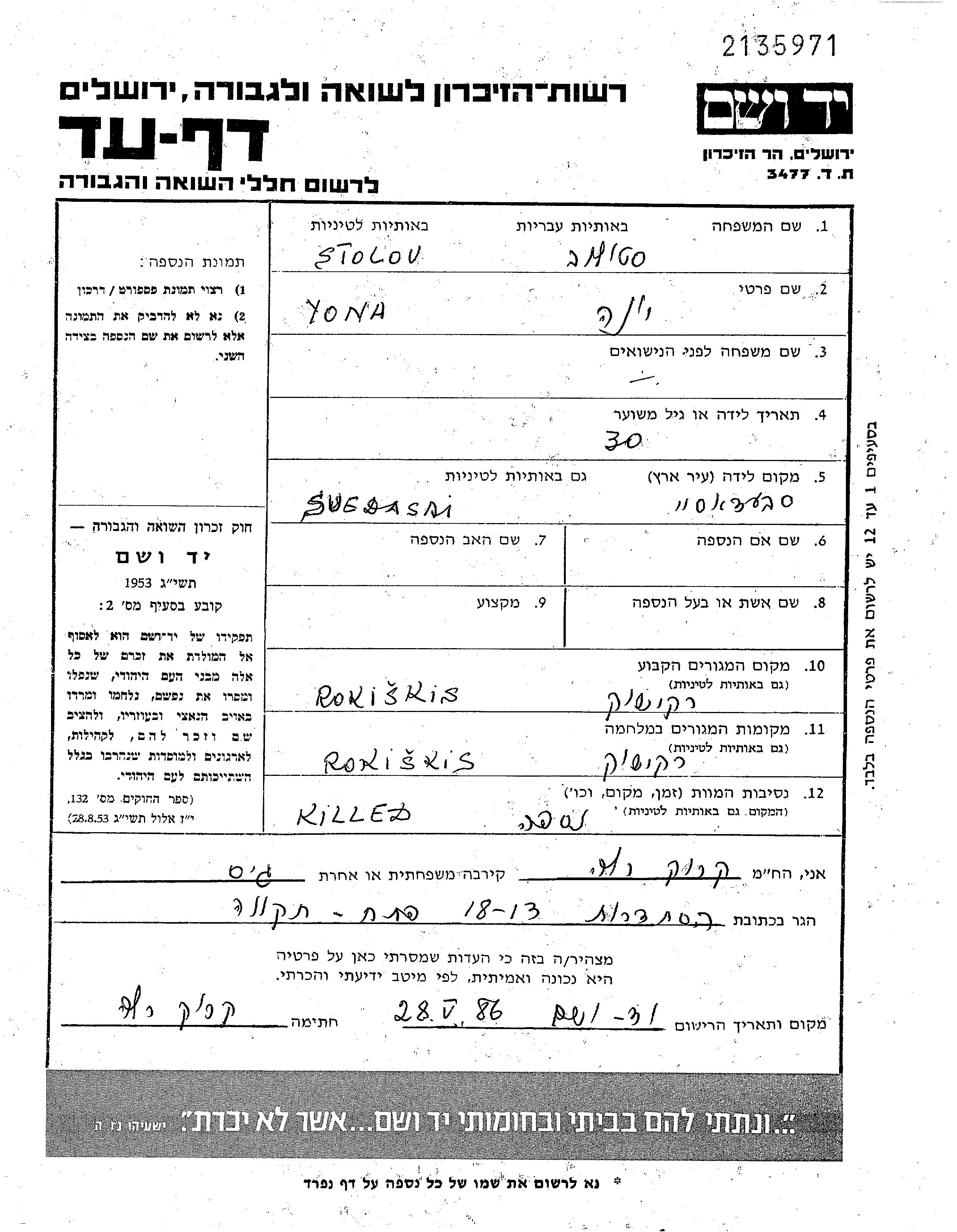 יונה נרצח בשואה. מקום המוות: Rokiškis שבליטא.