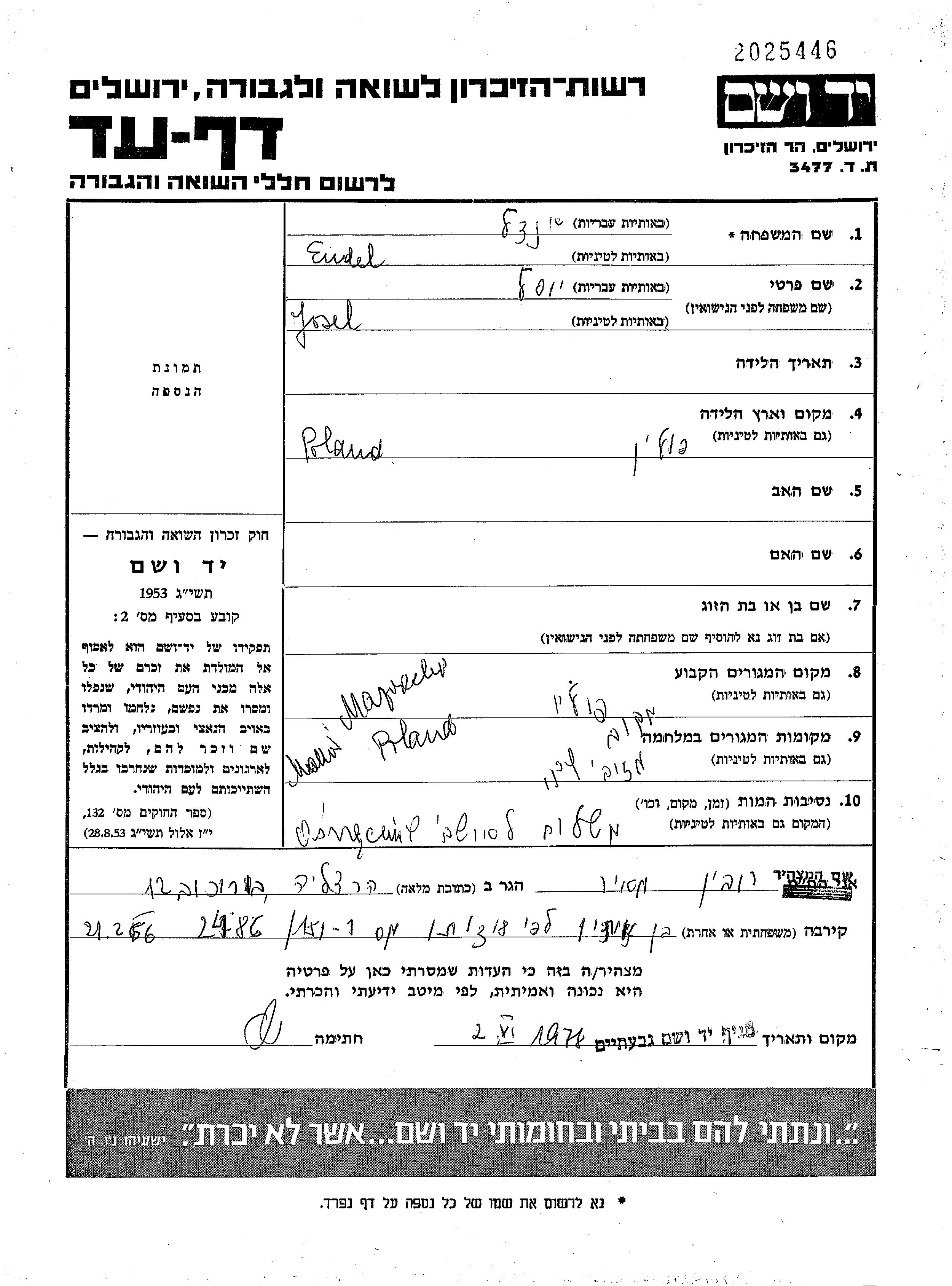 Josel אנדל נולד בפולין. לפני מלחמת העולם השניה התגורר בWysokie Mazowieckie שבפולין. בזמן המלחמה הוא היה בWysokie Mazowieckie שבפולין. הוא נרצח בשואה. מקום המוות: Auschwitz שבפולין.