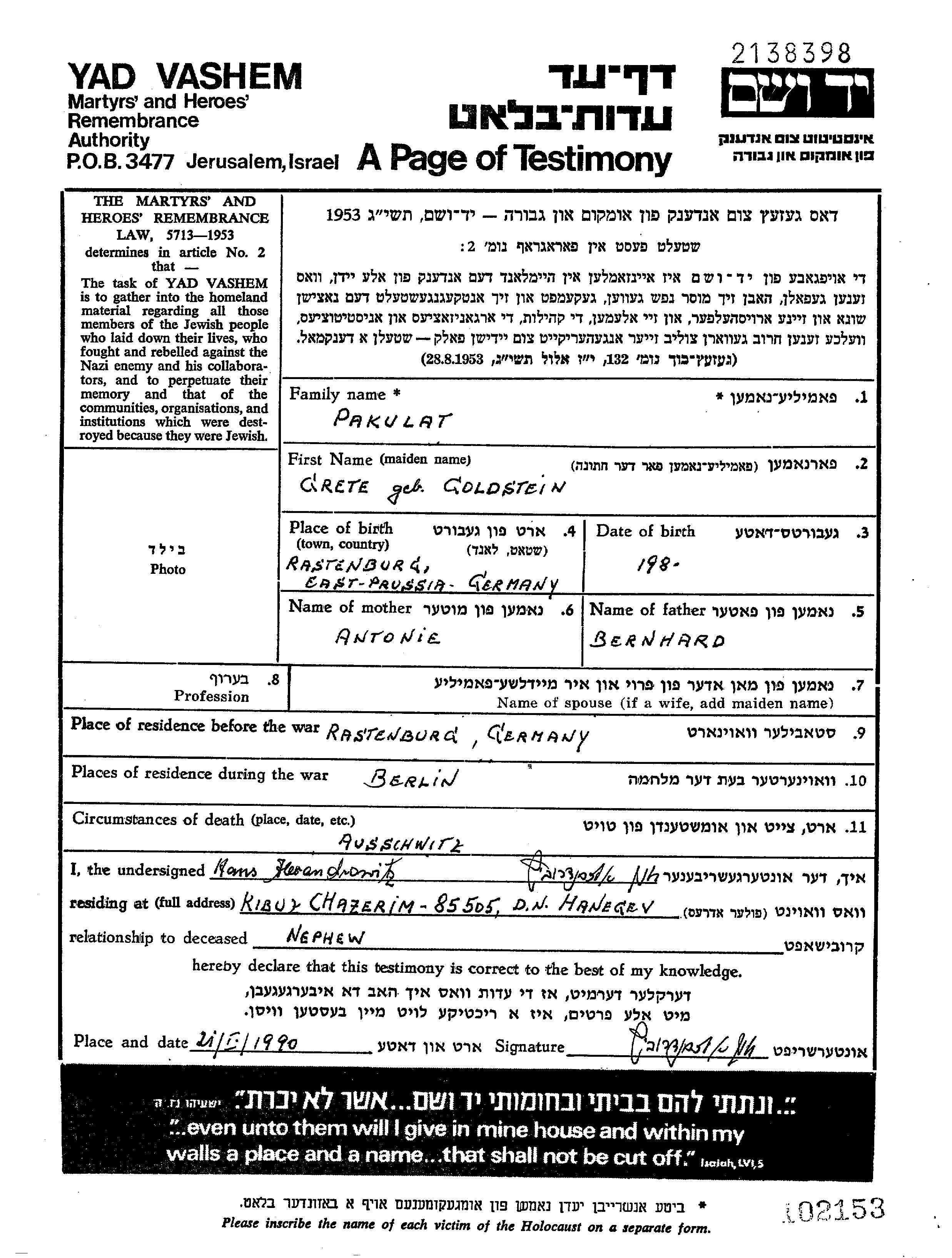 Grete פקולט לבית Goldstein נולדה בRastenburg שבגרמניה לברנהרד וAntonie. לפני מלחמת העולם השניה התגוררה בRastenburg שבגרמניה. בזמן המלחמה היא היתה בBerlin שבגרמניה.