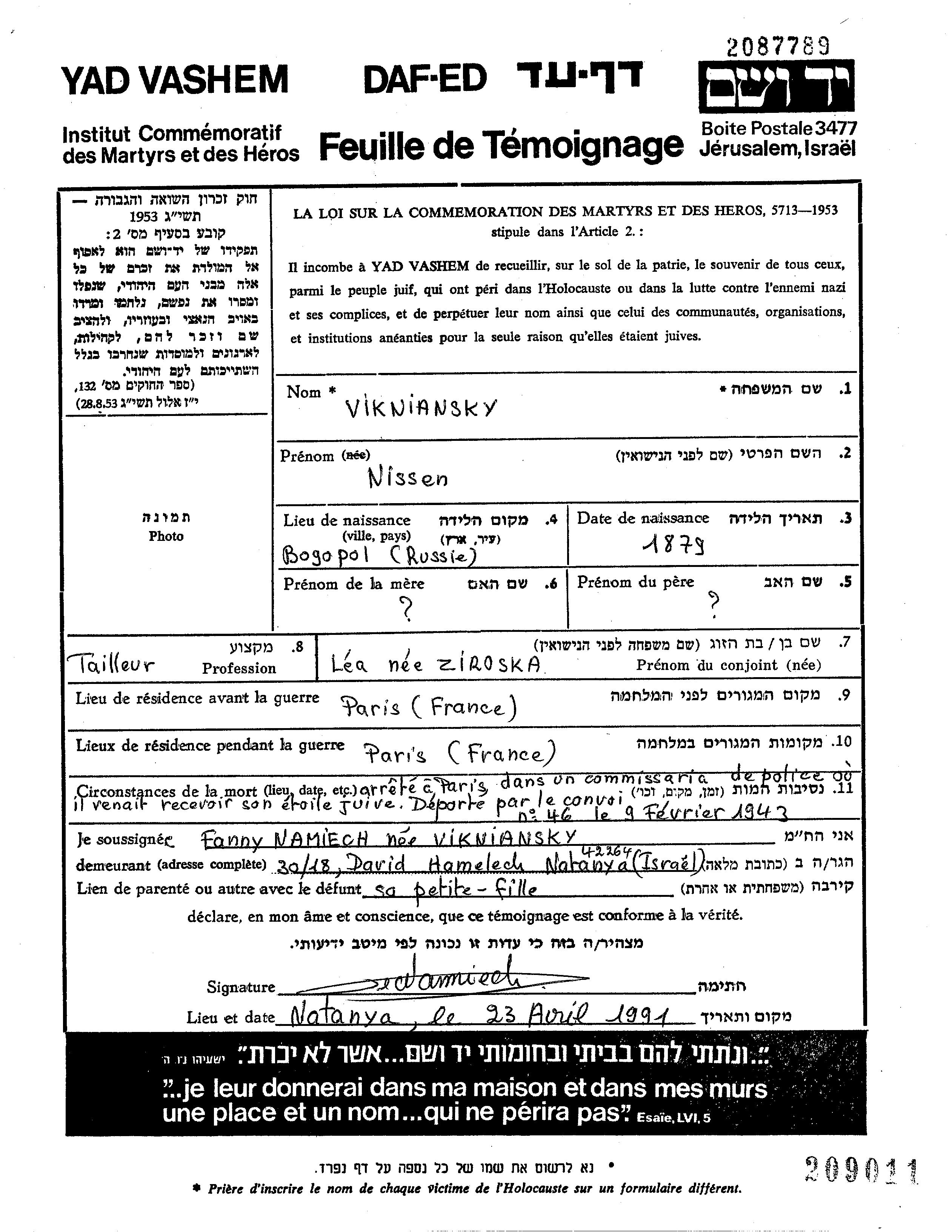Nissen Vikniansky נולד בBogopol שבאוקראינה (ברה"מ). הוא היה חייט ונשוי ללאה. לפני מלחמת העולם השניה התגורר בParis שבצרפת. בזמן המלחמה הוא היה בParis שבצרפת. הוא נרצח בשואה. מקום המוות: Auschwitz שבפולין.
