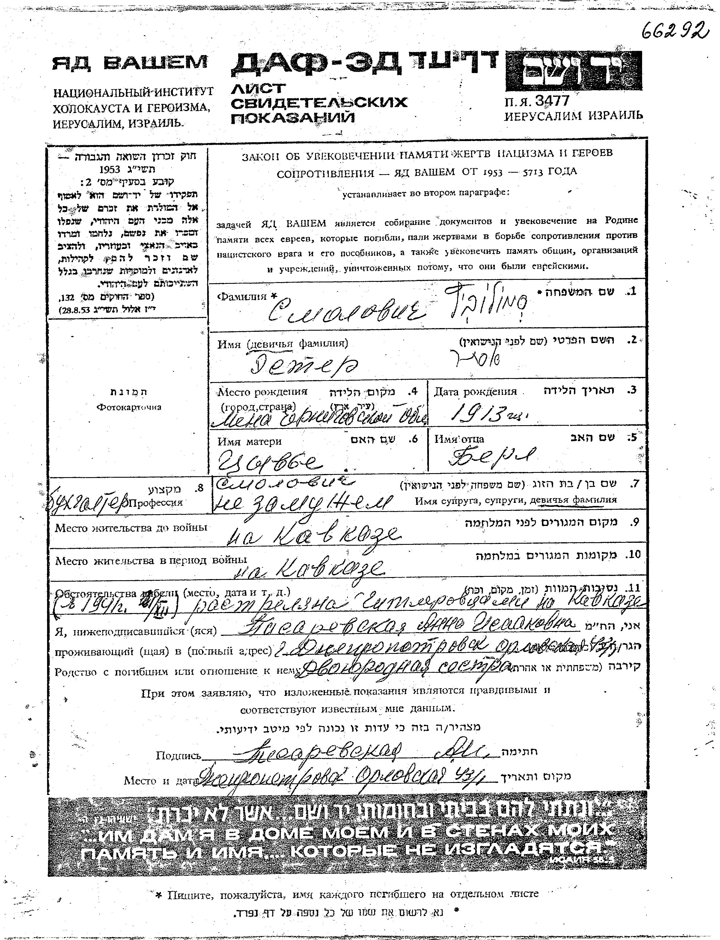 אסתר נרצחה בשואה. מקום המוות: Caucasus Region שברוסיה (ברה"מ).