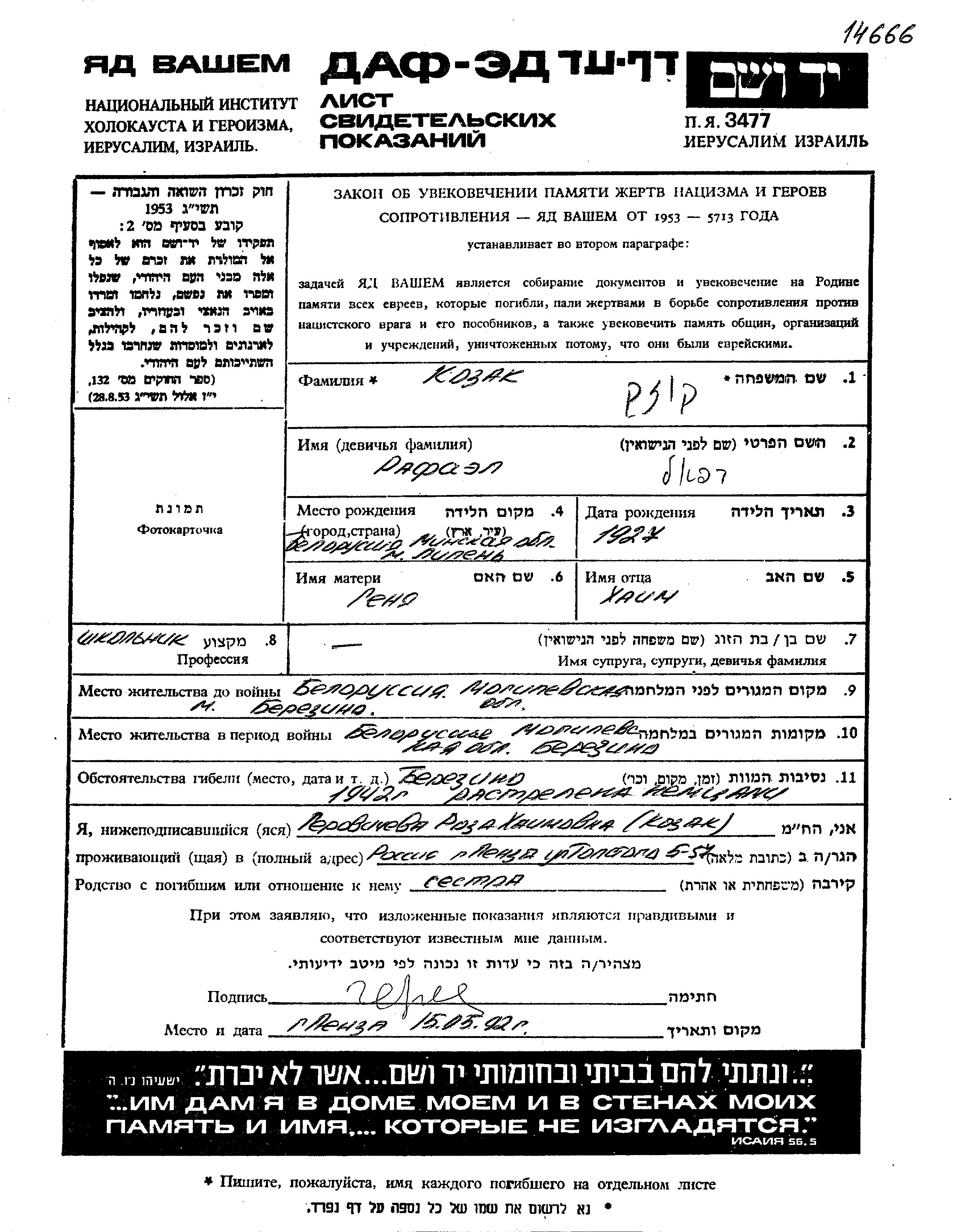 רפאל Kozak נולד בLipen שבביאלורוסיה (ברה"מ) בשנת 1927 לחיים וGenia לבית וינוקור. הוא היה תלמיד וילד. לפני מלחמת העולם השניה התגורר בBerezino שבביאלורוסיה (ברה"מ). בזמן המלחמה הוא היה בBerezino שבביאלורוסיה (ברה"מ). רפאל נרצח בשואה. מקום המוות: Berezino שבביאלורוסיה (ברה"מ) בשנת 1942.