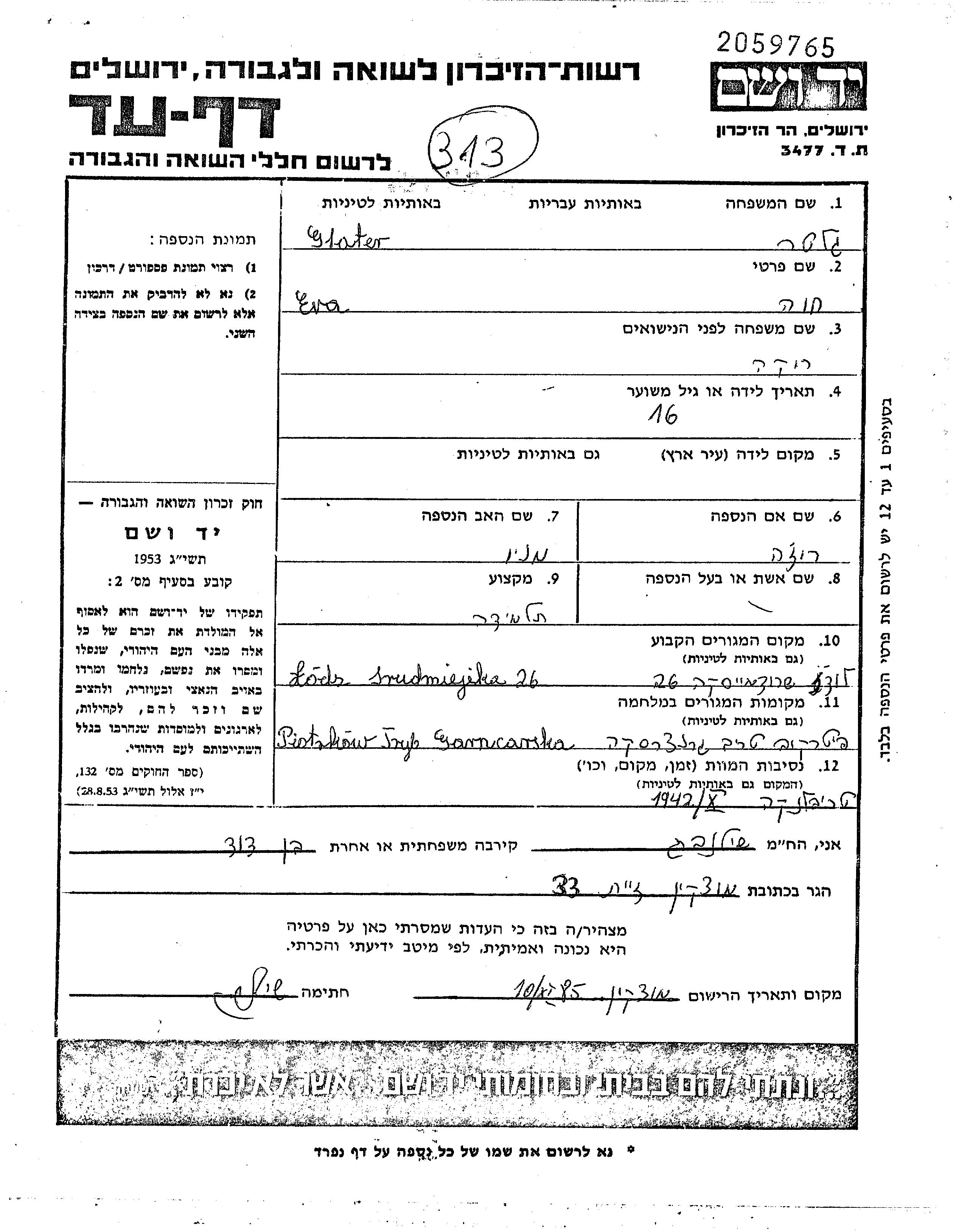 עיר/כפר, גטו/מחנה או אתר רצח או מחוז/אזור או מדינה. שם מקום ניתן לחפש רק בא-ב לטיני.