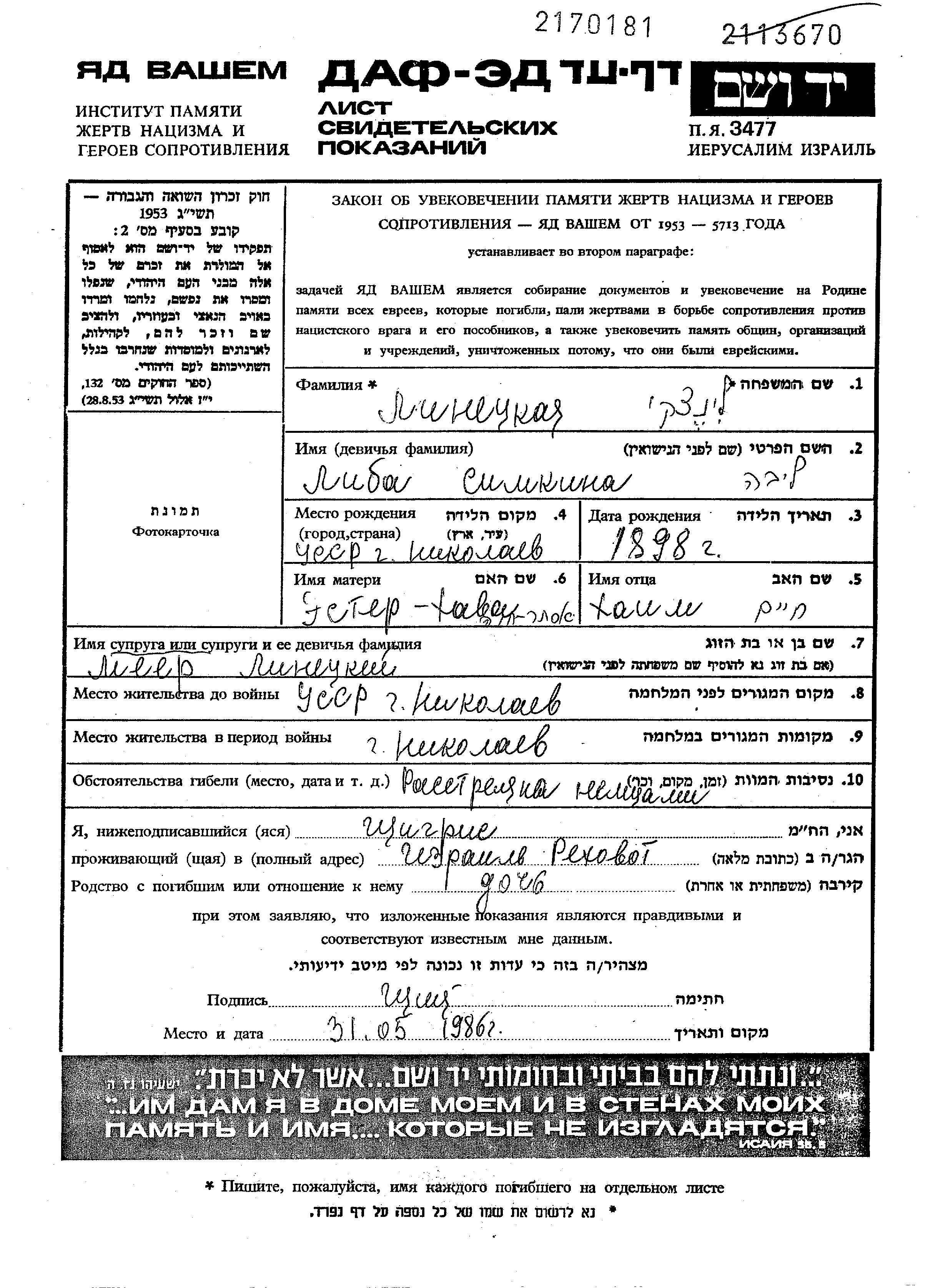 ליבה לינצקי לבית סימקין נולדה בNikolayev שבאוקראינה (ברה"מ) בשנת 1898 לחיים ואסתר חוה. היא היתה נשואה לMeyer. לפני מלחמת העולם השניה התגוררה בNikolayev שבאוקראינה (ברה"מ). בזמן המלחמה היא היתה בNikolayev שבאוקראינה (ברה"מ). ליבה נרצחה בשואה.
