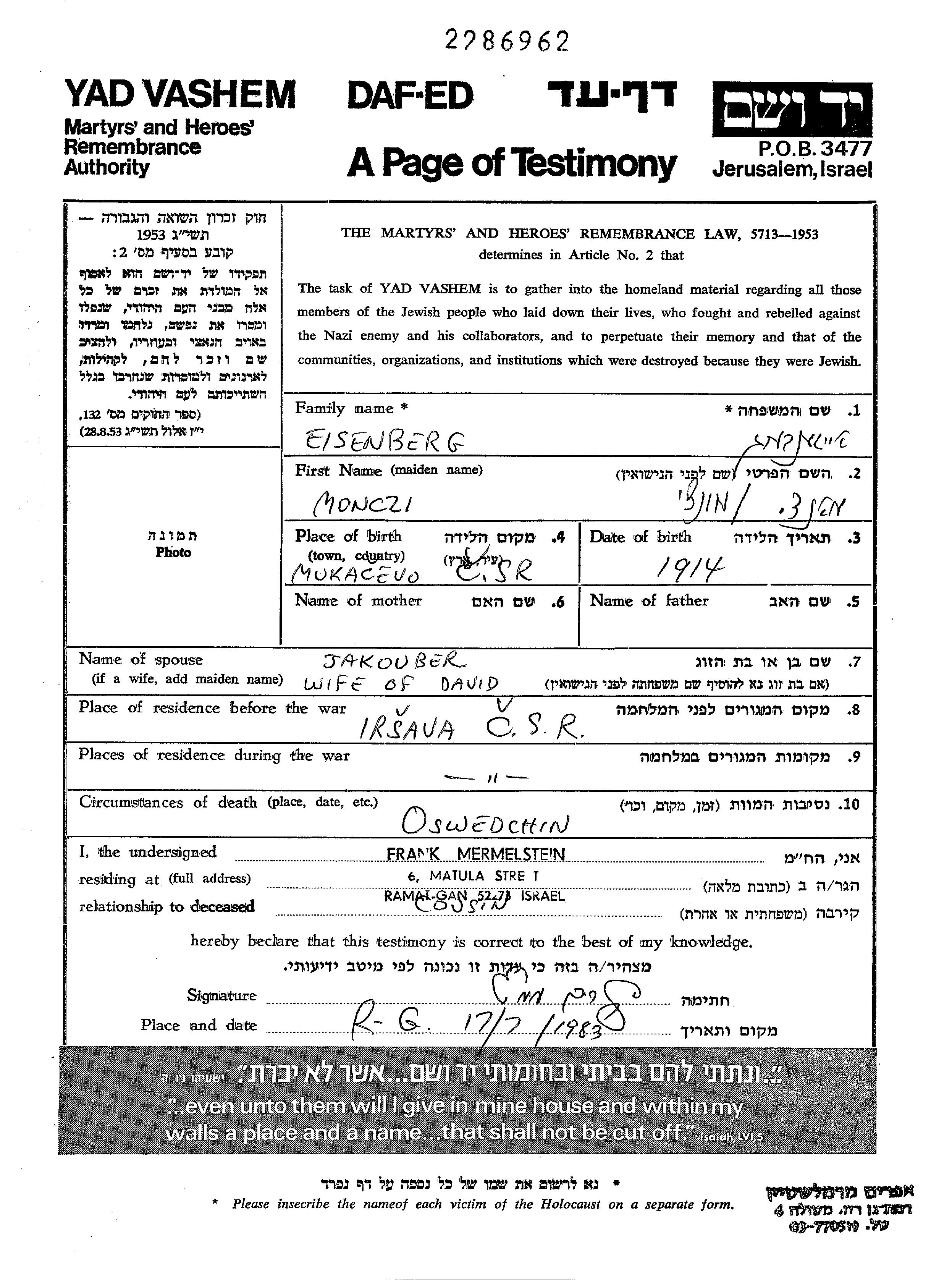 Monci Eisenberg לבית Jakouber נולדה בMukacevo שבצ'כוסלובקיה בשנת 1914. לפני מלחמת העולם השניה התגוררה בIrsava שבצ'כוסלובקיה. בזמן המלחמה היא היתה בIrsava שבצ'כוסלובקיה.