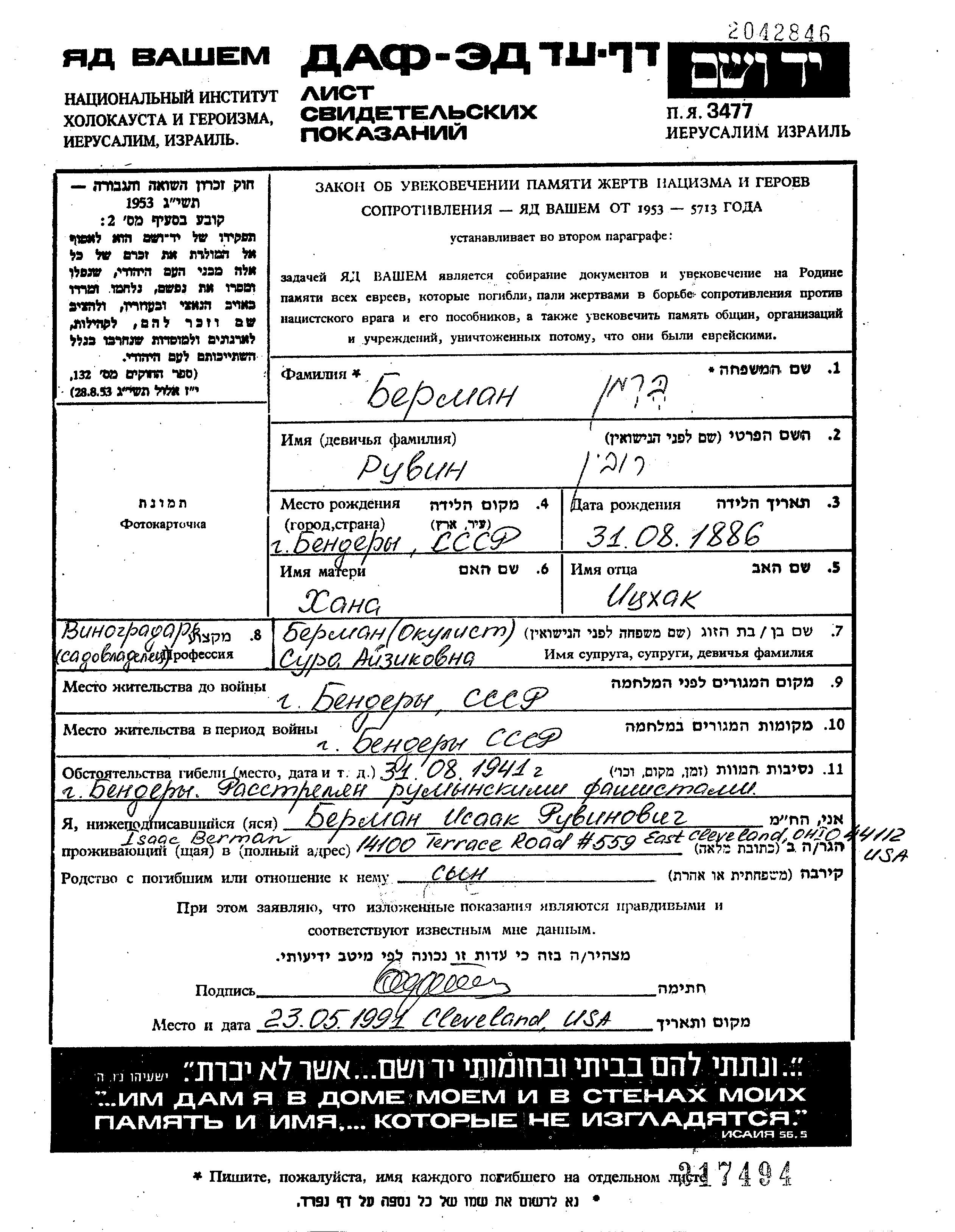 הוא נרצח בשואה. מקום המוות: Bendery שברומניה בשנת 31/08/1941.