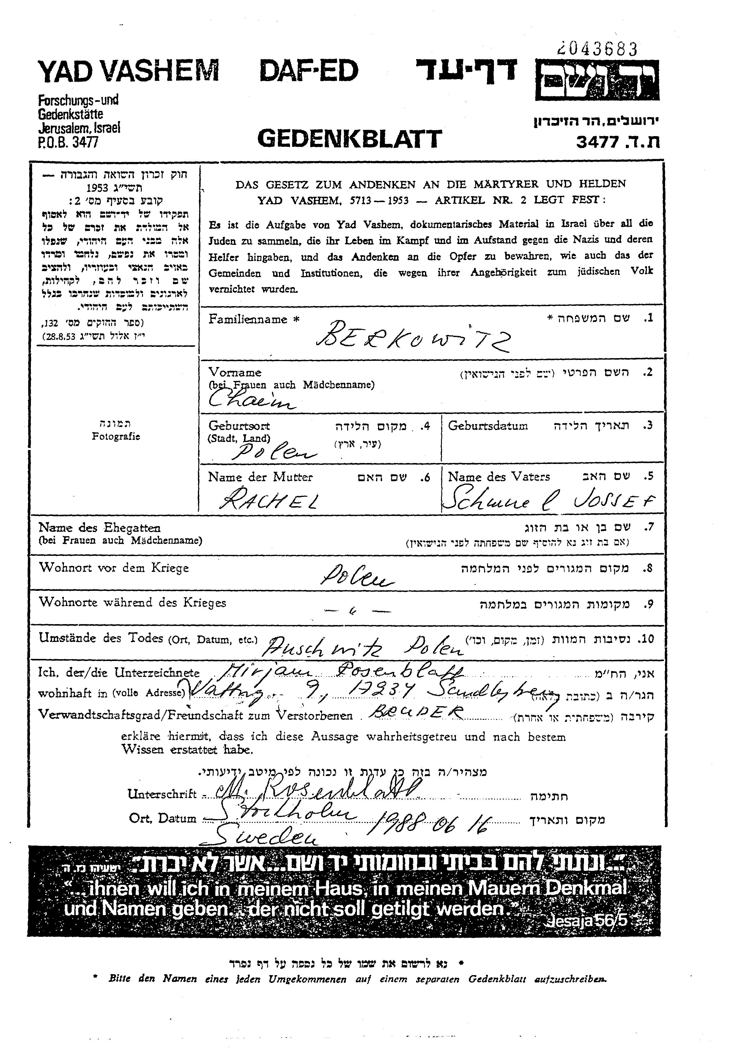 חיים נרצח בשואה. מקום המוות: Auschwitz שבפולין.