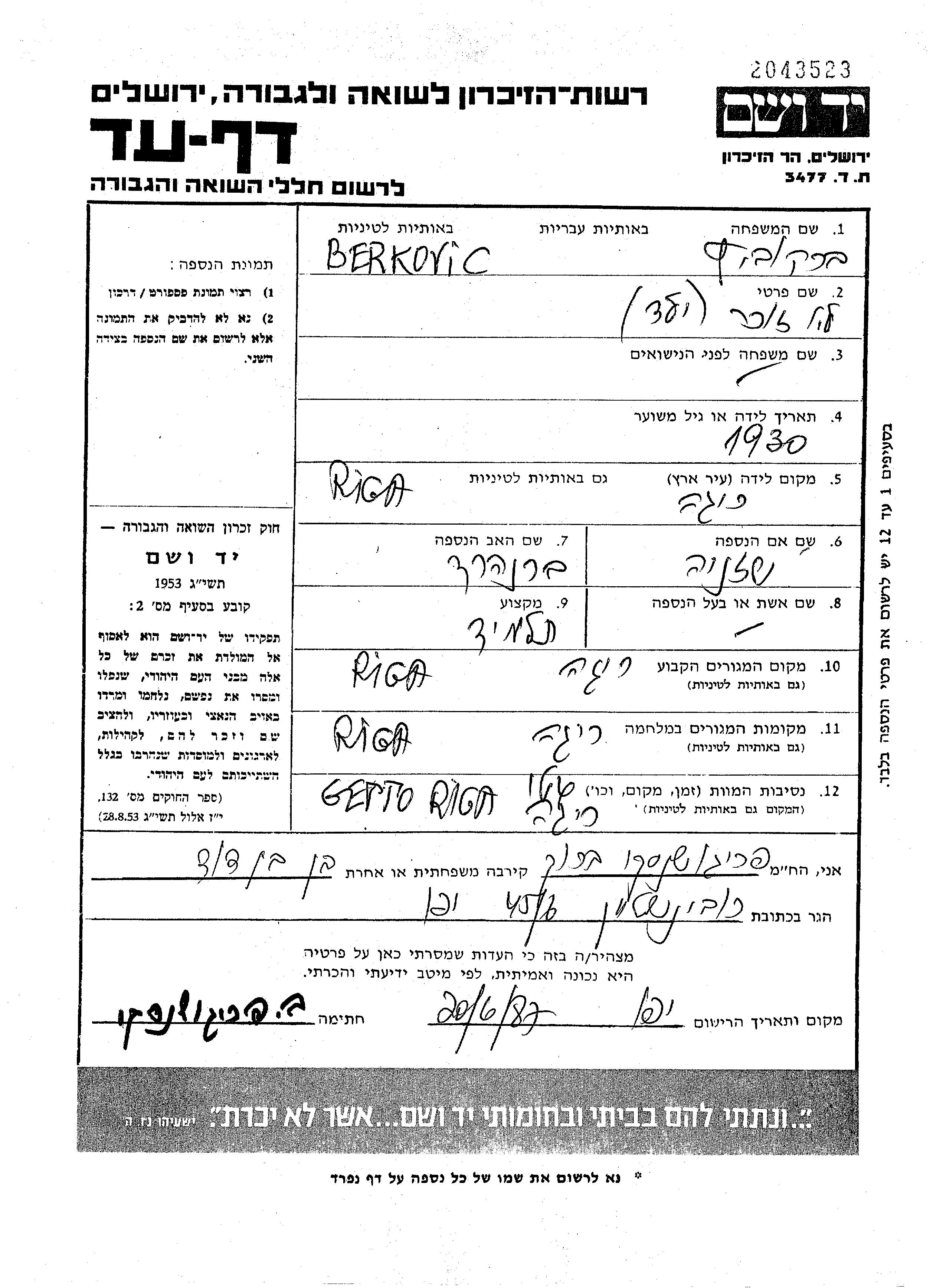 Berkovic שם פרטי לא ידוע 1930 Riga, לטביה דף-עד