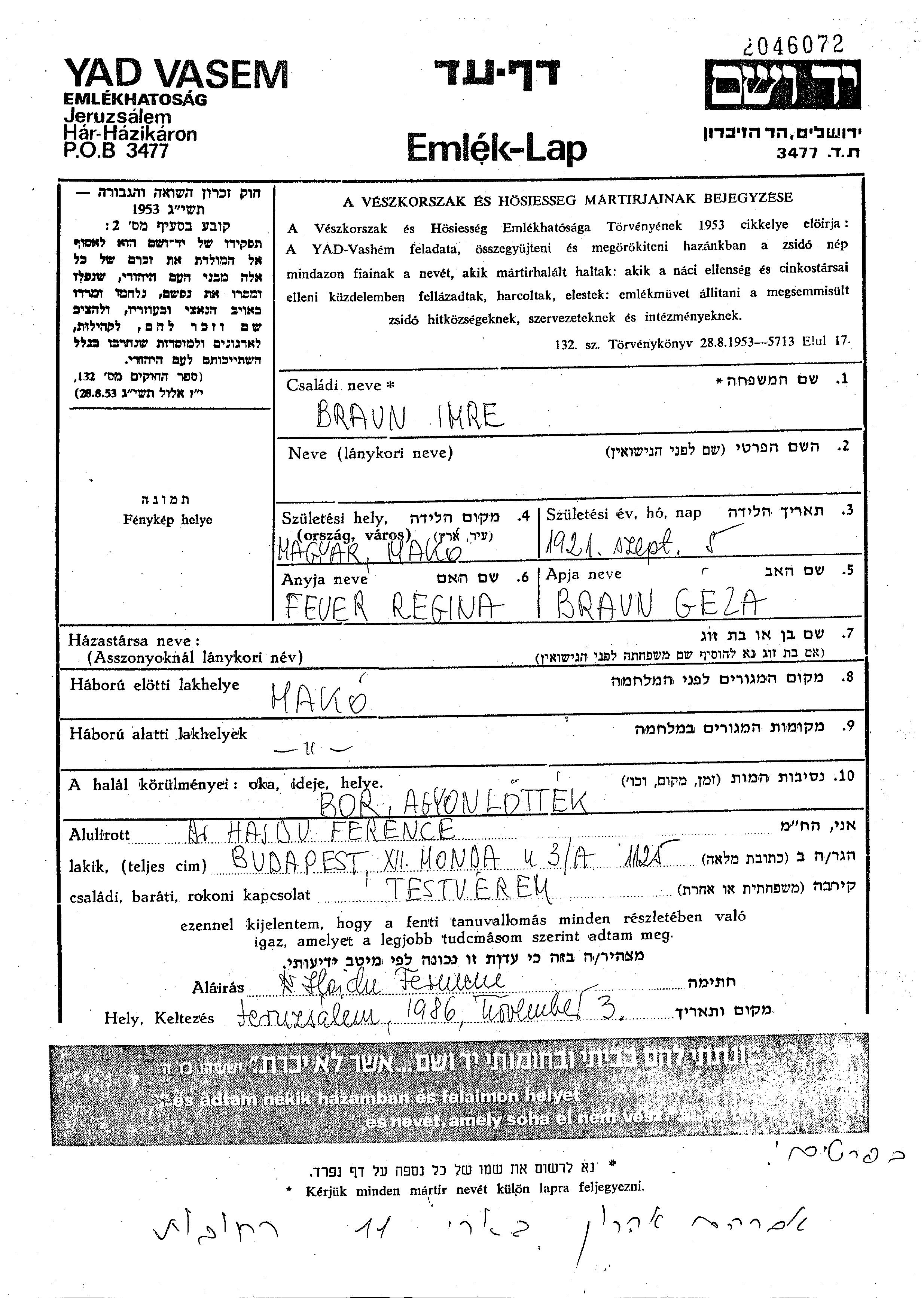 אימרה בראון נולד בMako שבהונגריה בשנת 1921 לגזה ורגינה לבית Feuer. לפני מלחמת העולם השניה התגורר בMako שבהונגריה. בזמן המלחמה הוא היה בMako שבהונגריה.