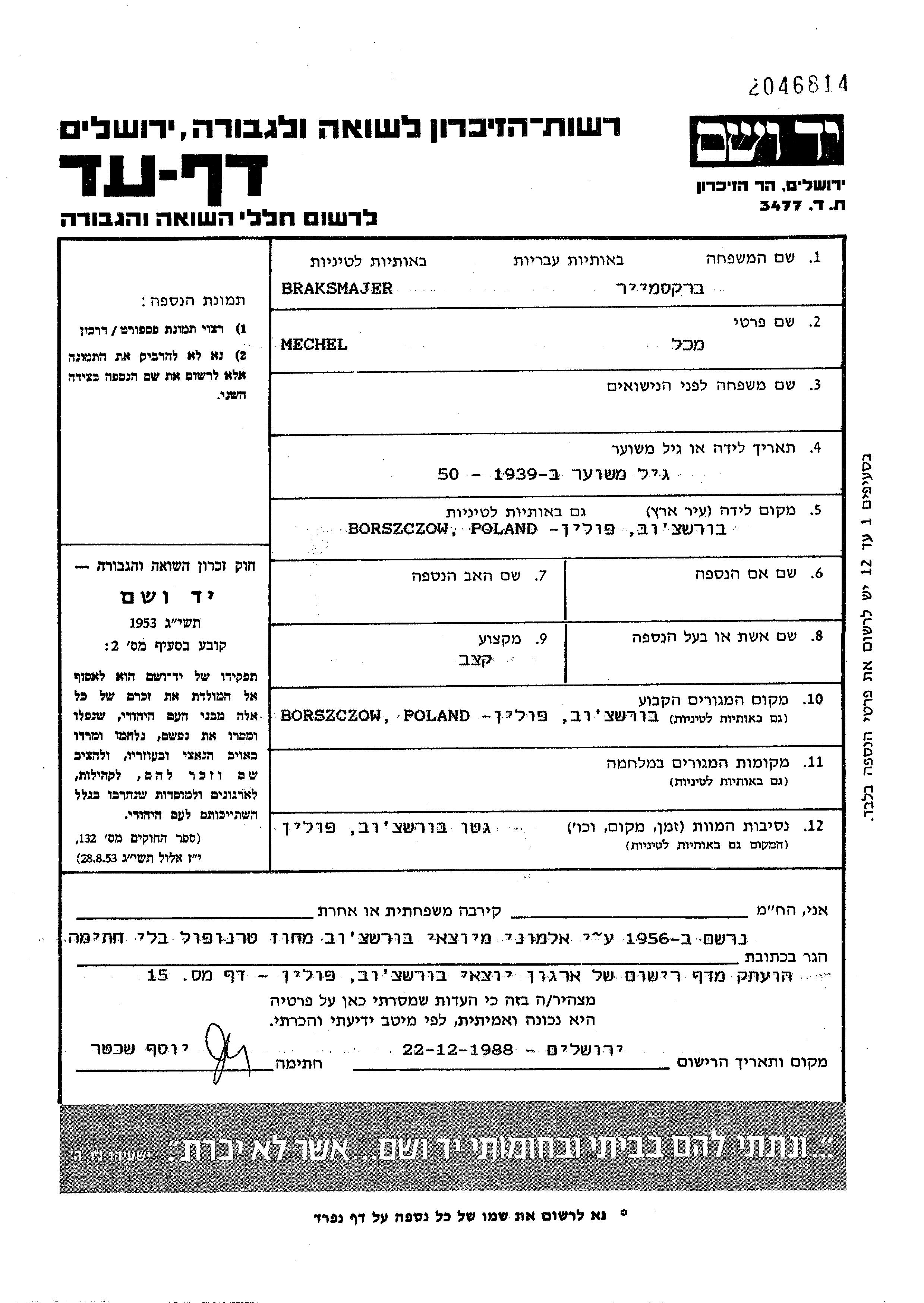Mechel Braksmajer נולד בBorszczow שבפולין. הוא היה קצב. לפני מלחמת העולם השניה התגורר בBorszczow שבפולין. בזמן המלחמה הוא היה בBorszczow שבפולין.