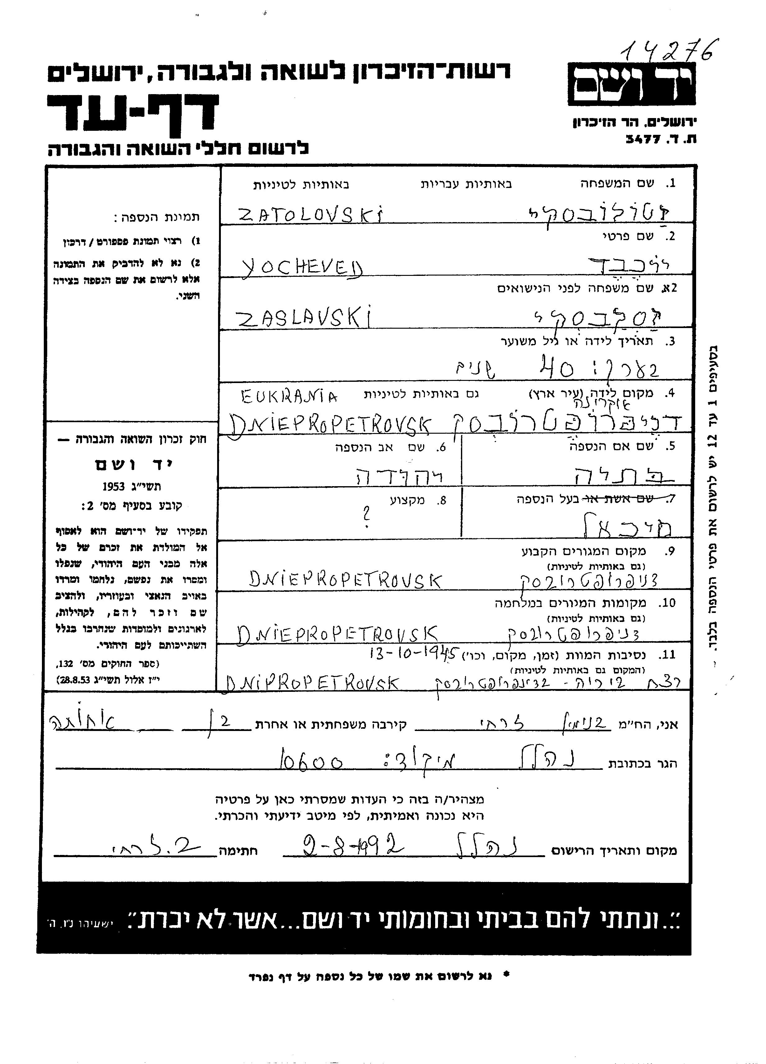 Yocheved Zatolovski לבית זסלווסקי נולדה בDnepropetrovsk שבאוקראינה (ברה"מ) ליהודה ובתיה. היא היתה נשואה למיכאל. לפני מלחמת העולם השניה התגוררה בDnepropetrovsk שבאוקראינה (ברה"מ). בזמן המלחמה היא היתה בDnepropetrovsk שבאוקראינה (ברה"מ). היא נרצחה בשואה. מקום המוות: Dnepropetrovsk שבאוקראינה (ברה"מ) בשנת 13/10/1941.