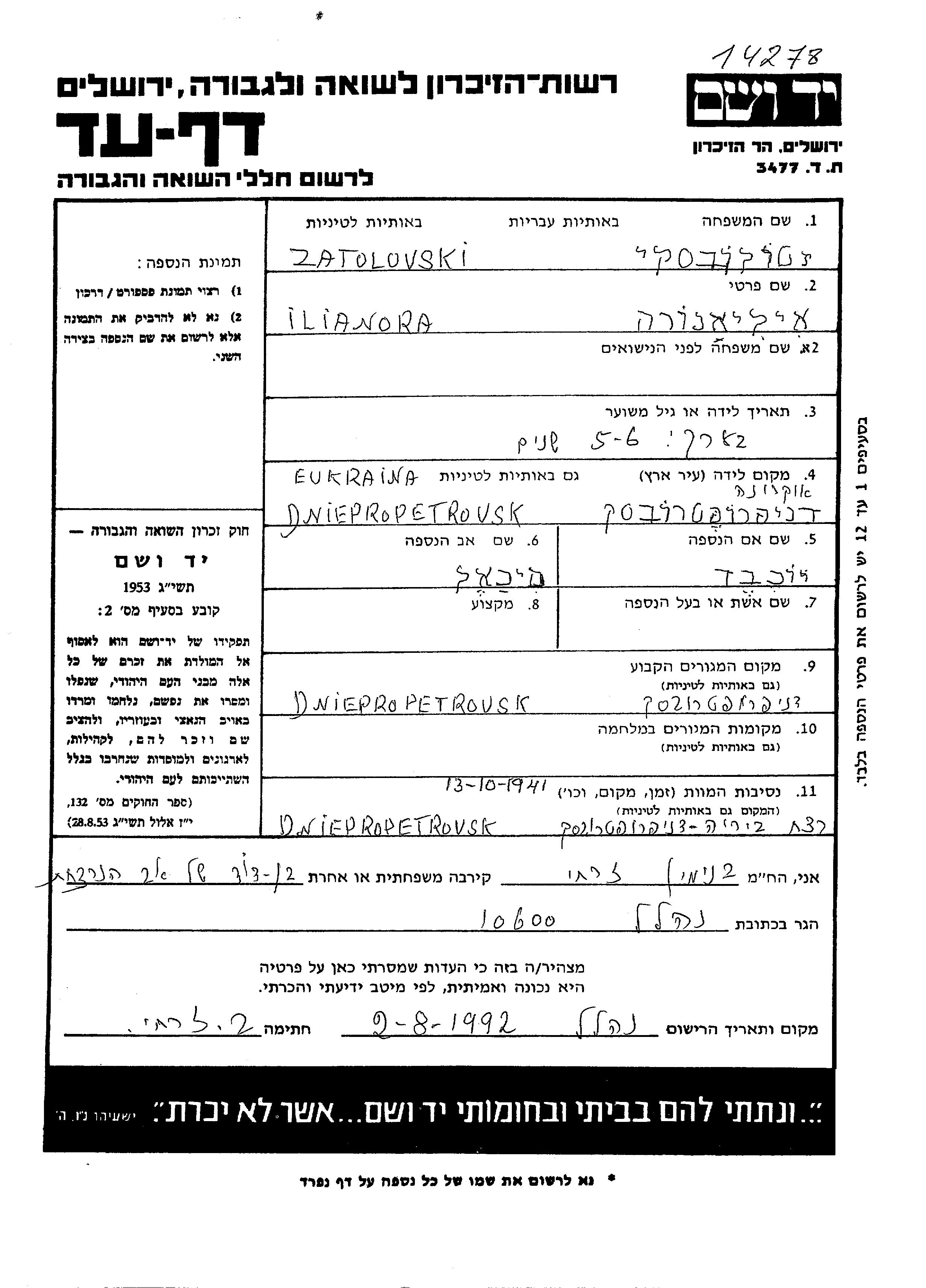 Zatolovski Ilianora Dnepropetrovsk, אוקראינה (ברה"מ) דף-עד