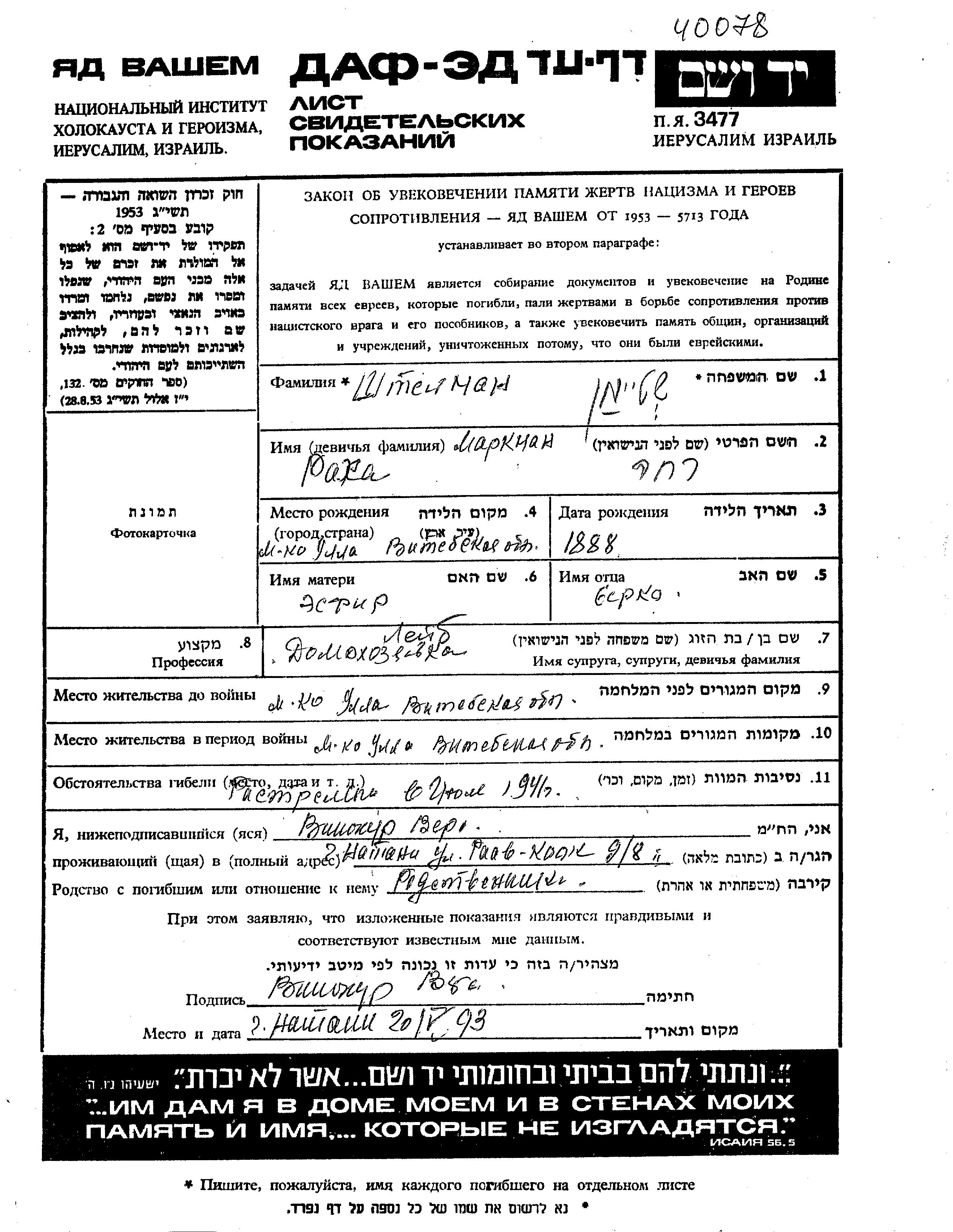 Rokha שטיימן לבית מרקמן נולדה בUlla שבביאלורוסיה (ברה"מ) בשנת 1888 לBerka וEsfir. היא היתה עקרת בית ונשואה ללייב. לפני מלחמת העולם השניה התגוררה בUlla שבביאלורוסיה (ברה"מ). בזמן המלחמה היא היתה בUlla שבביאלורוסיה (ברה"מ).