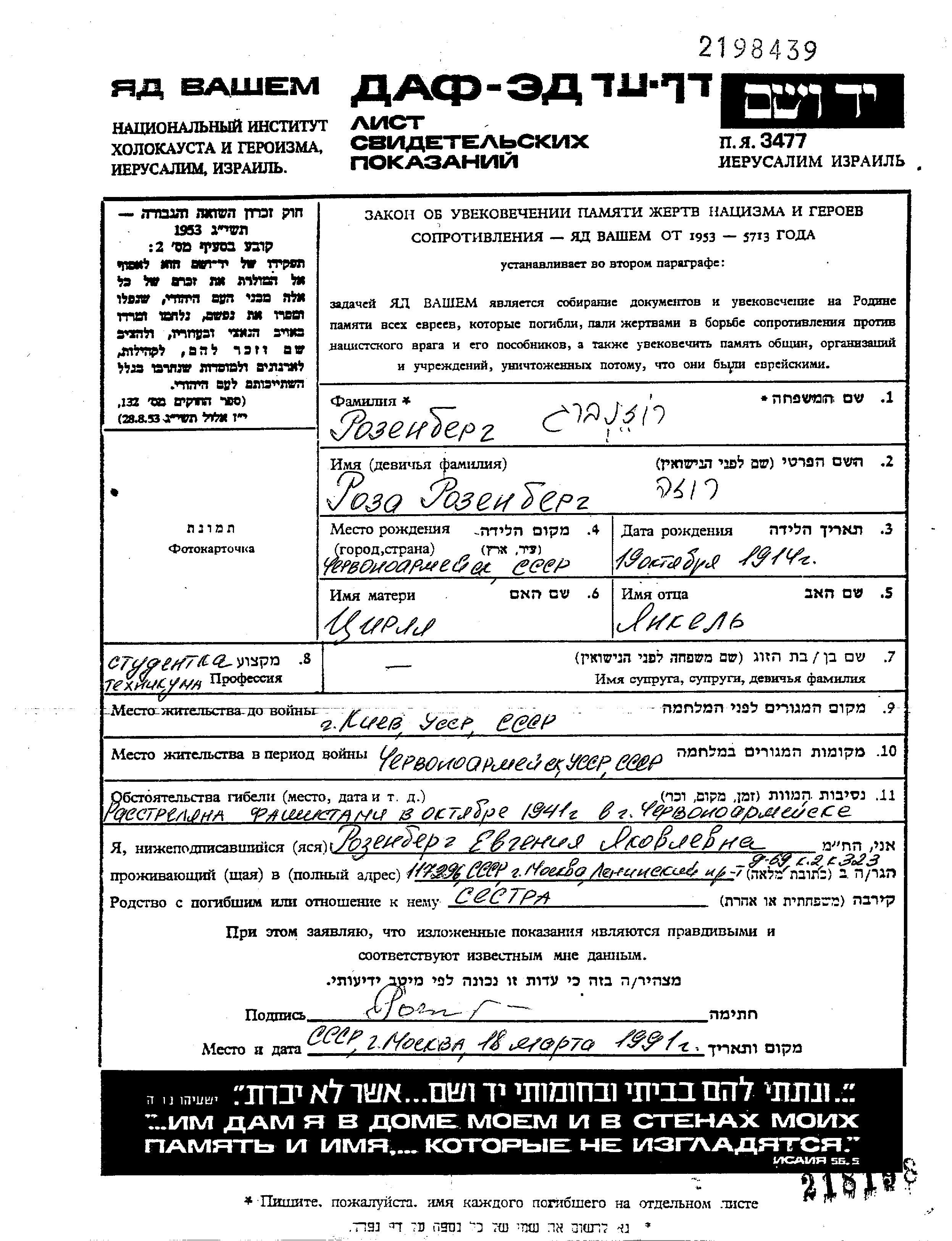 רוזה רוזנברג נולדה בChervonoarmeysk שבאוקראינה (ברה"מ) בשנת 1914 לYankel וTzirlya לבית ברונז. היא היתה סטודנטית. לפני מלחמת העולם השניה התגוררה בKiyev שבאוקראינה (ברה"מ). בזמן המלחמה היא היתה בChervonoarmeysk שבאוקראינה (ברה"מ). רוזה נרצחה בשואה. מקום המוות: Chervonoarmeysk שבאוקראינה (ברה"מ) בשנת 1941.