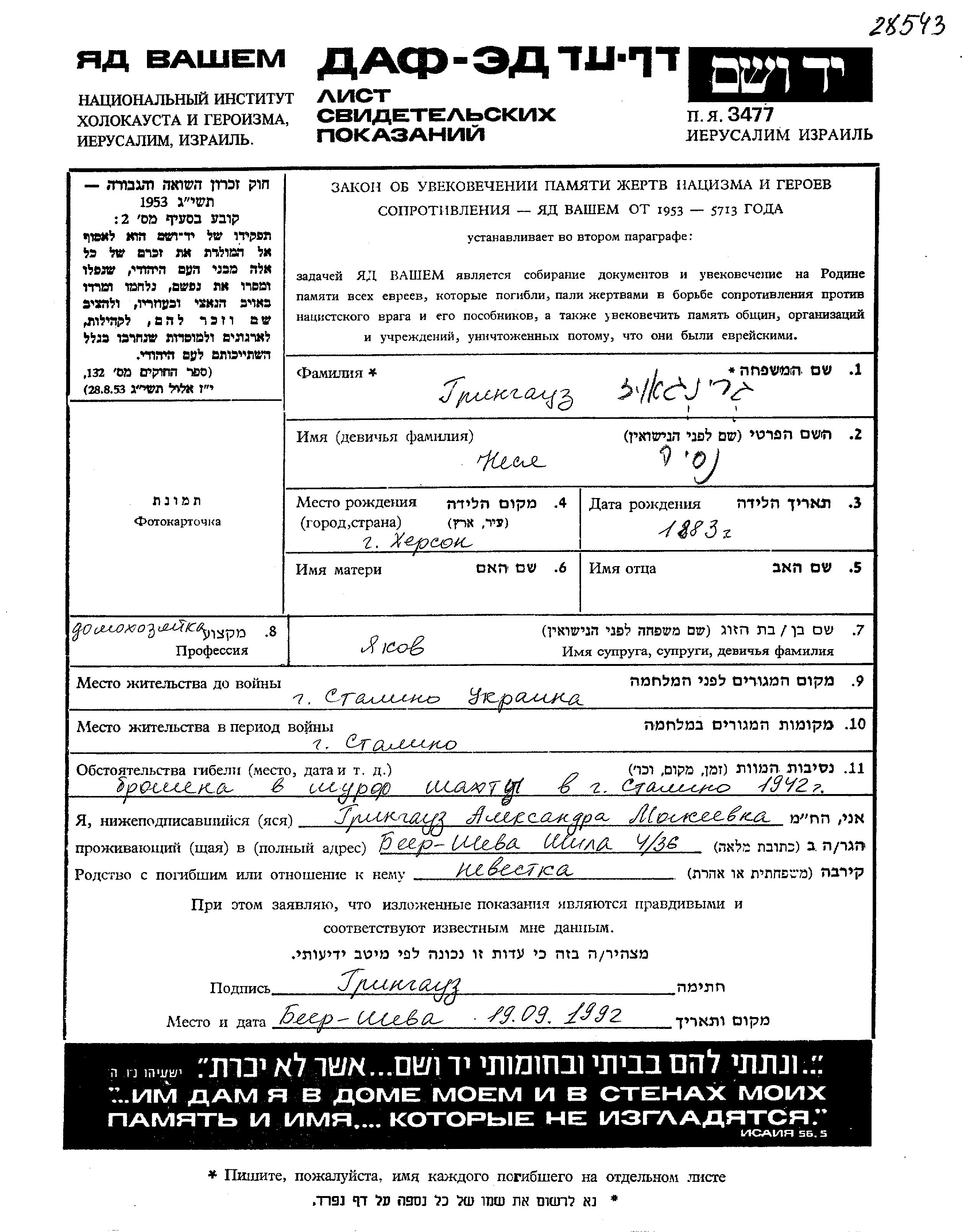Nesia גרינגאוז נולדה בKherson שבאוקראינה (ברה"מ) בשנת 1883. היא היתה עקרת בית ונשואה לYakov. לפני מלחמת העולם השניה התגוררה בStalino שבאוקראינה (ברה"מ). בזמן המלחמה היא היתה בStalino שבאוקראינה (ברה"מ). היא נרצחה בשואה. מקום המוות: Stalino שבאוקראינה (ברה"מ) בשנת 1942.