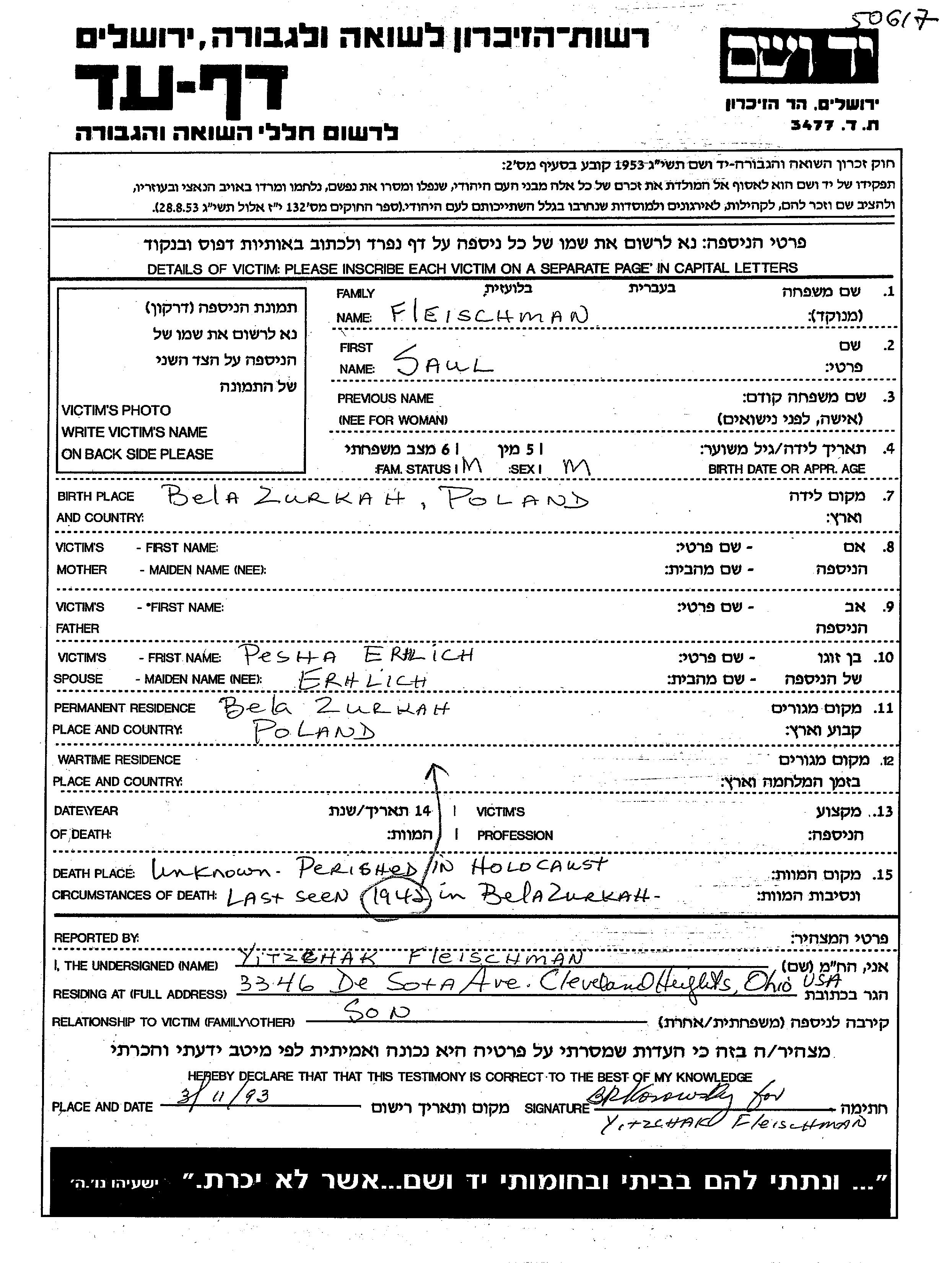 סאול Fleischman נולד בBialozorka שבפולין. הוא היה נשוי לPesha. לפני מלחמת העולם השניה התגורר בBialozorka שבפולין. בזמן המלחמה הוא היה בBialozorka שבפולין.