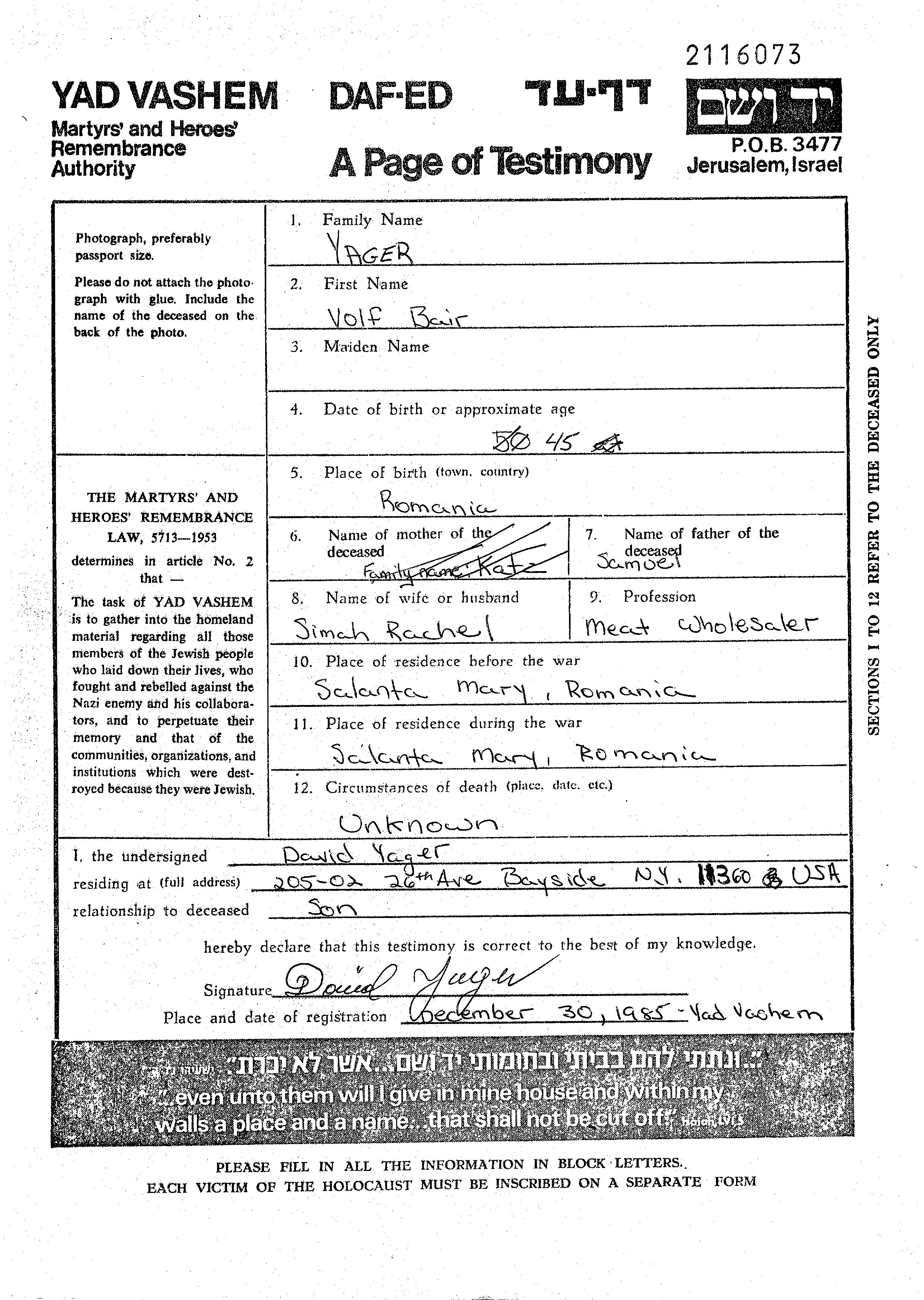 Bair וולף Yager נולד ברומניה לסמואל. הוא היה בעל איטליז ונשוי לSimah רחל. לפני מלחמת העולם השניה התגורר בSalonta שברומניה. בזמן המלחמה הוא היה בSalonta שברומניה.