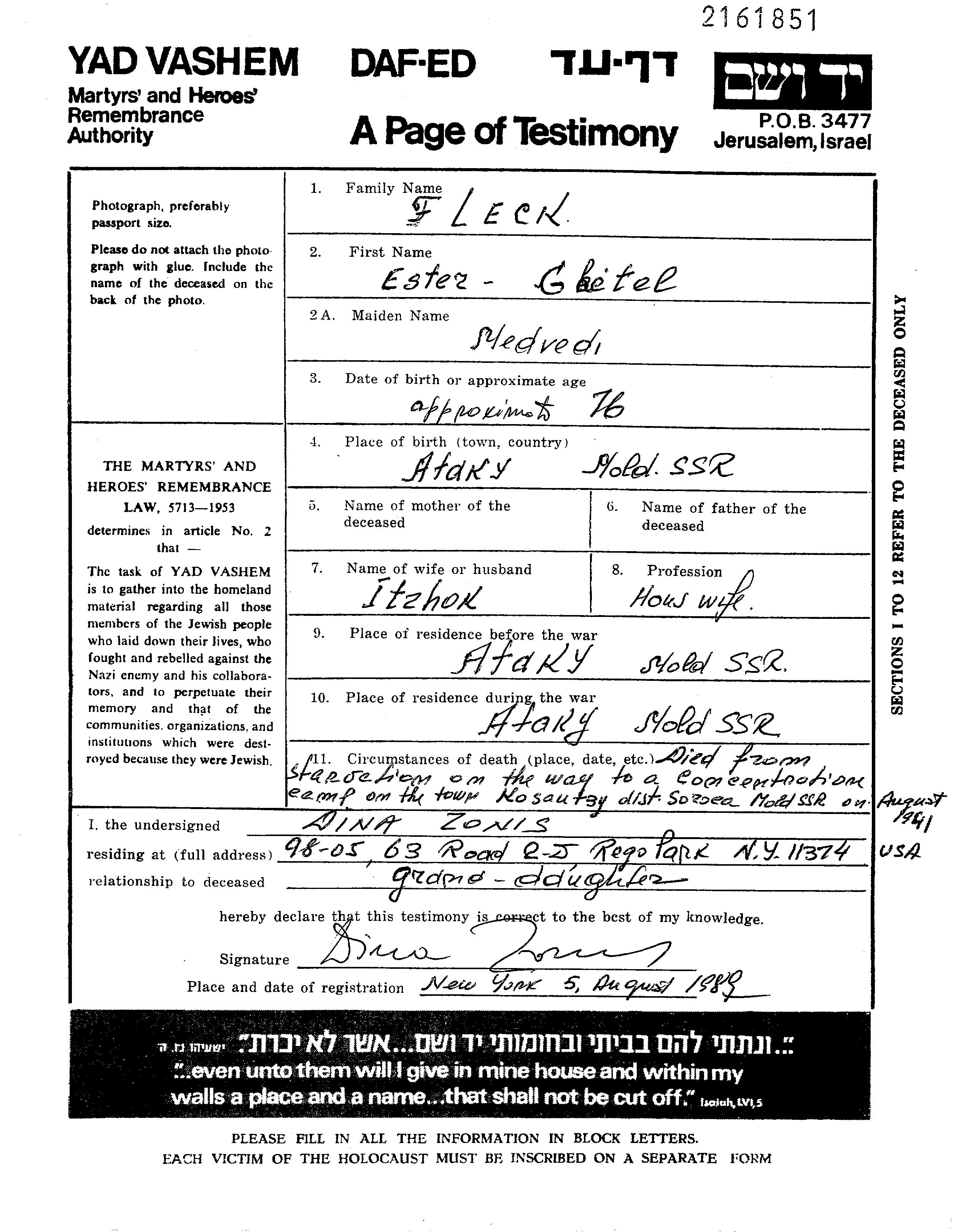 Gitel אסתר Fleck פלק לבית Medvedi נולדה בAtachi שברומניה בשנת 1864. היא היתה עקרת בית ונשואה לItzhok. לפני מלחמת העולם השניה התגוררה בAtachi שברומניה. בזמן המלחמה היא היתה בAtachi שברומניה.