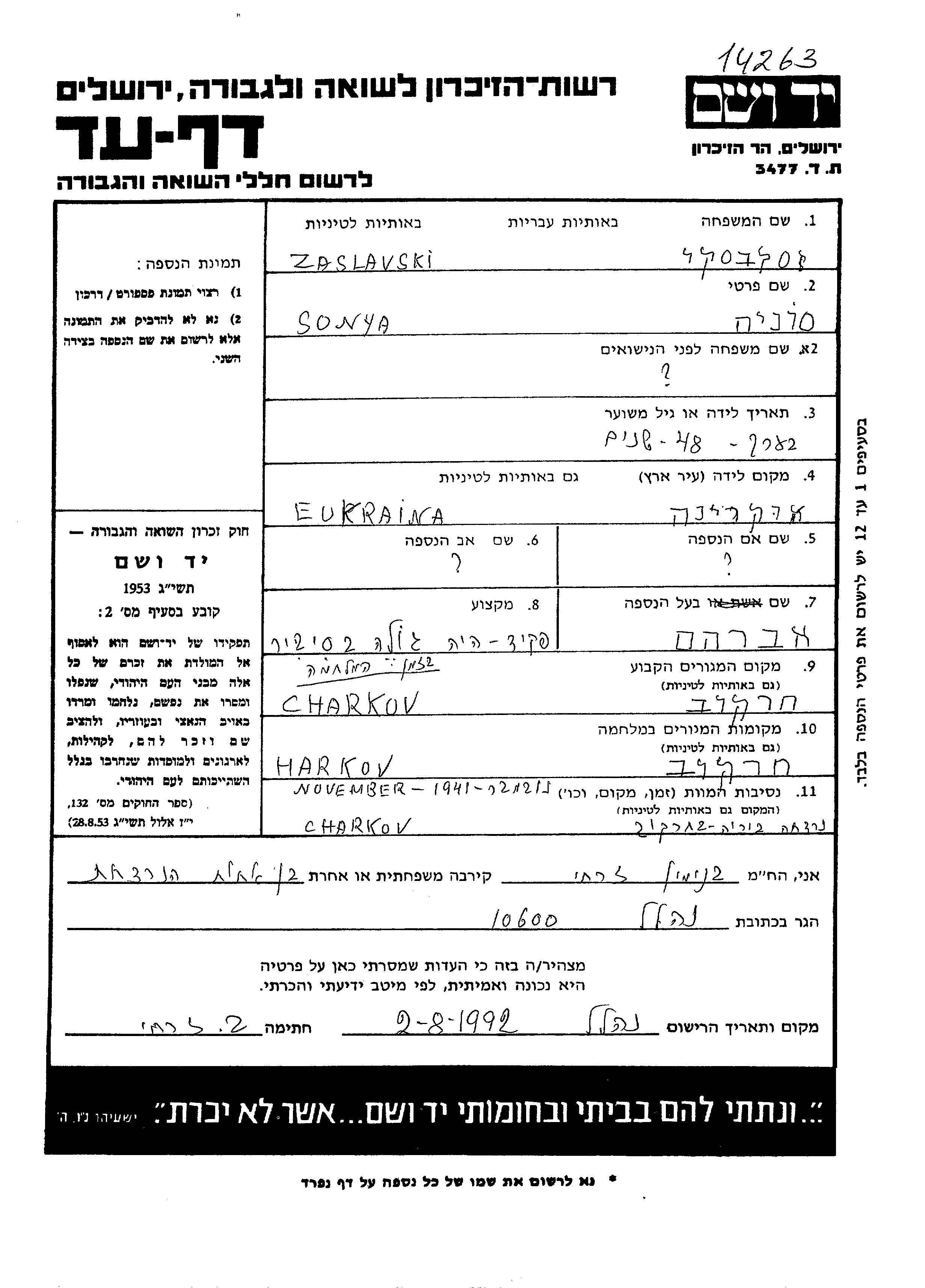 Sonya זסלווסקי נולדה באוקראינה (ברה"מ). היא היתה נשואה לAbraham. לפני מלחמת העולם השניה התגוררה בKharkov שבאוקראינה (ברה"מ). בזמן המלחמה היא היתה בKharkov שבאוקראינה (ברה"מ). היא נרצחה בשואה. מקום המוות: Kharkov שבאוקראינה (ברה"מ) בשנת 1941.