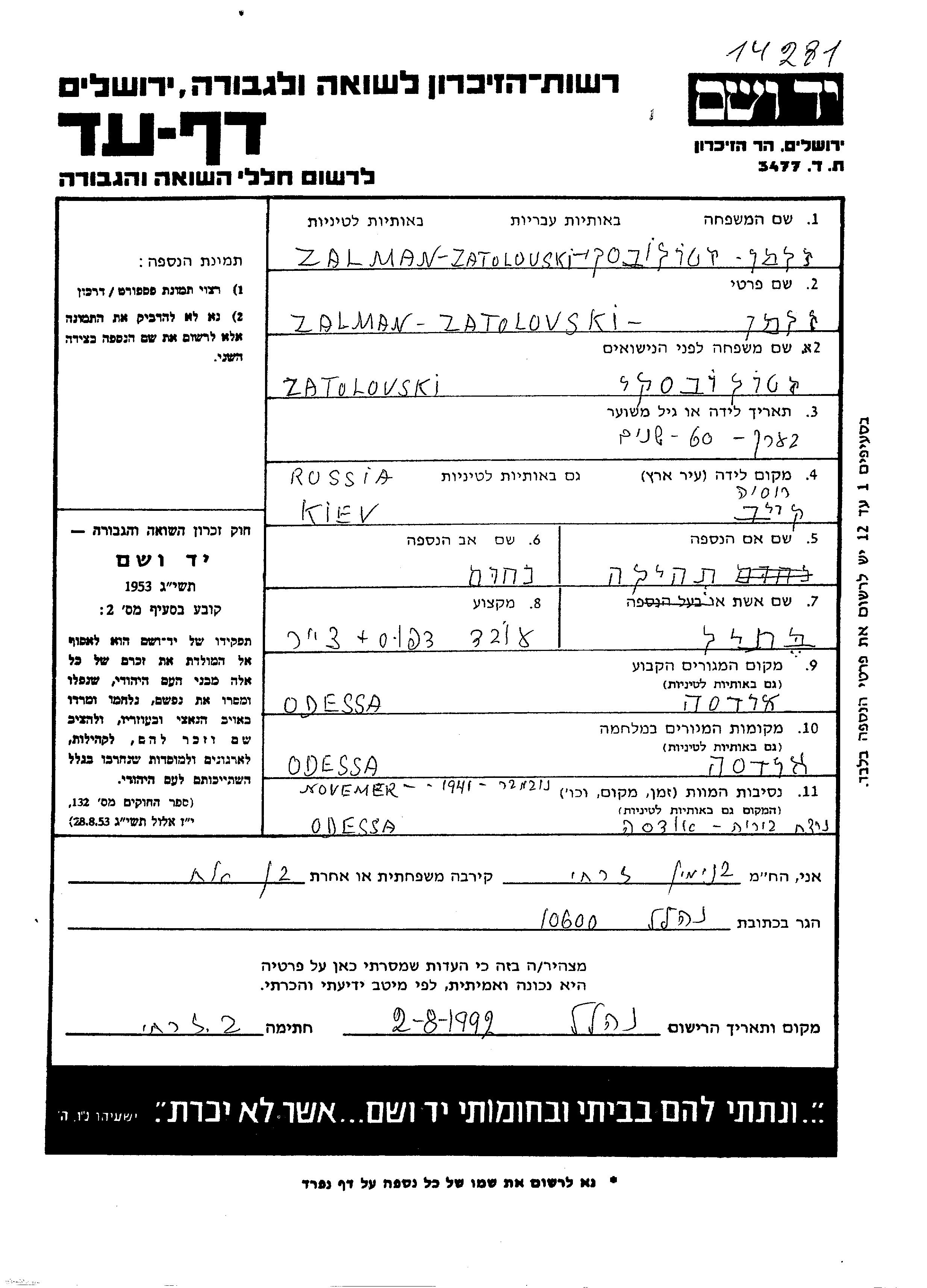 זלמן Zatolovski נולד בKiyev שבאוקראינה (ברה"מ) בשנת 1881 לנחום וTkhila. הוא היה סדר ונשוי לBetil. לפני מלחמת העולם השניה התגורר בOdessa שבאוקראינה (ברה"מ). בזמן המלחמה הוא היה בOdessa שבאוקראינה (ברה"מ).
