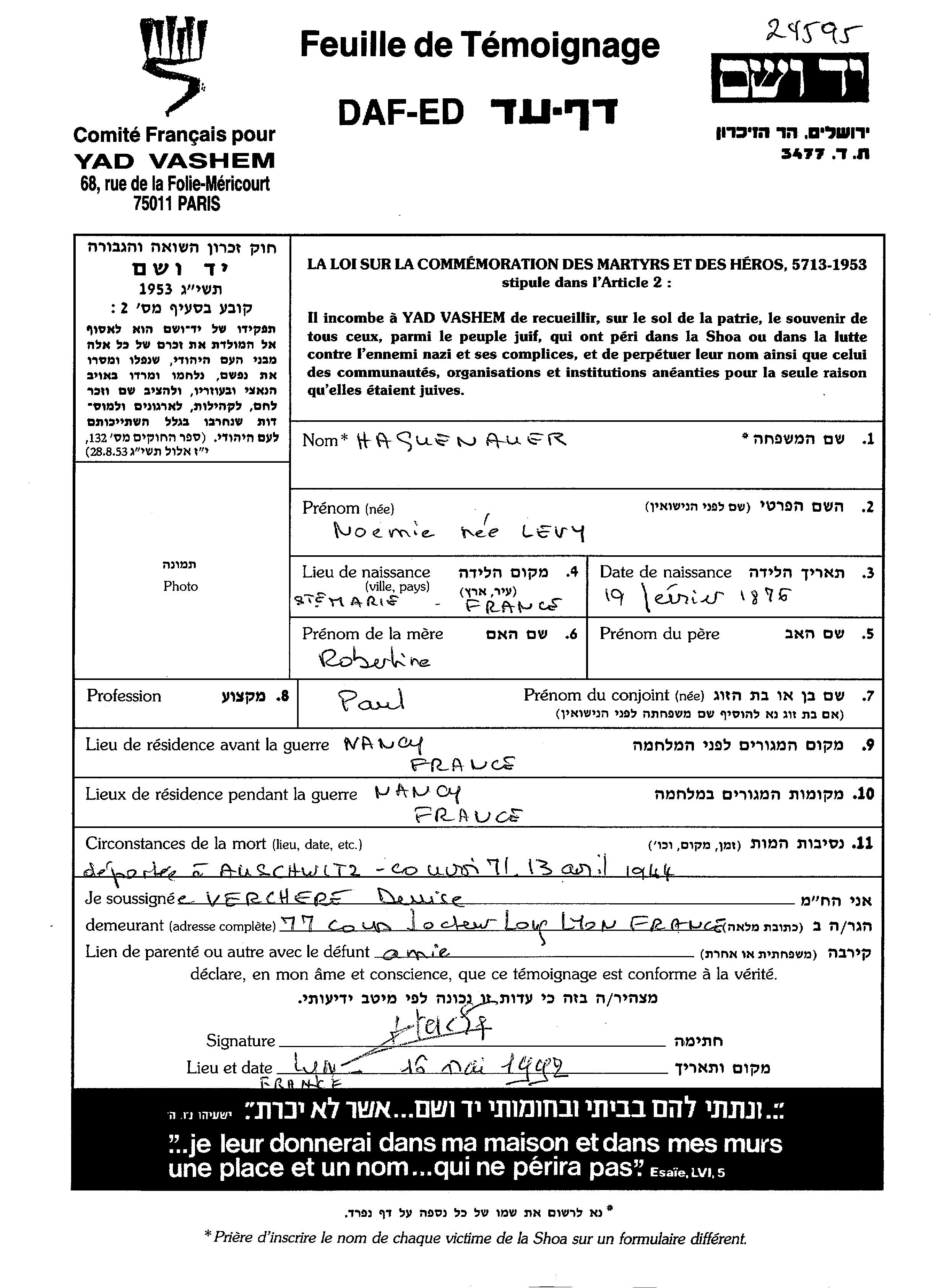 Noemie Haguenauer לבית Levy נולדה בצרפת שבצרפת בשנת 1876 לRobertine. היא היתה נשואה לפאול. לפני מלחמת העולם השניה התגוררה בNancy שבצרפת. בזמן המלחמה היא היתה בNancy שבצרפת.