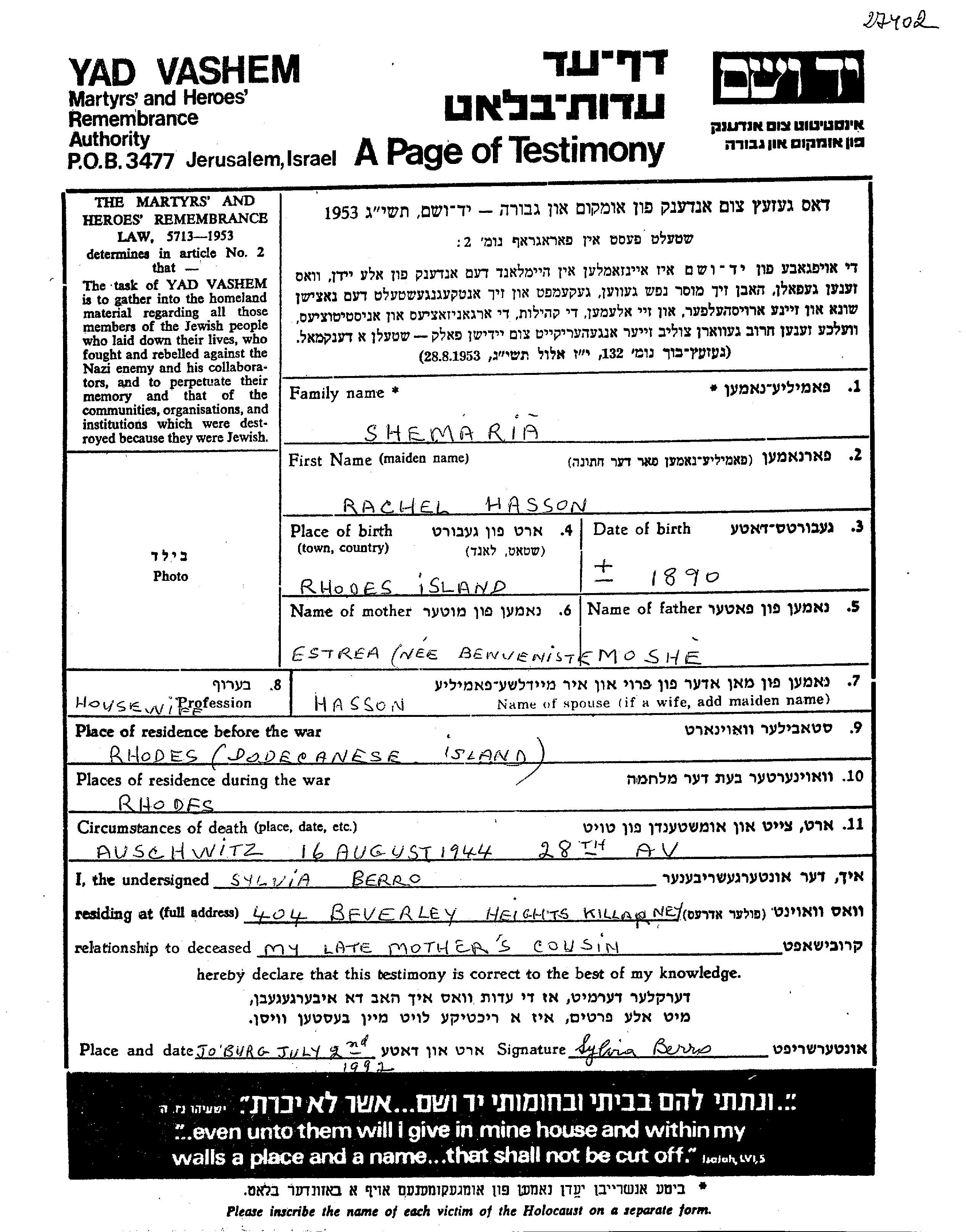 שמריה רחל 1890 Rhodes, איטליה דף-עד