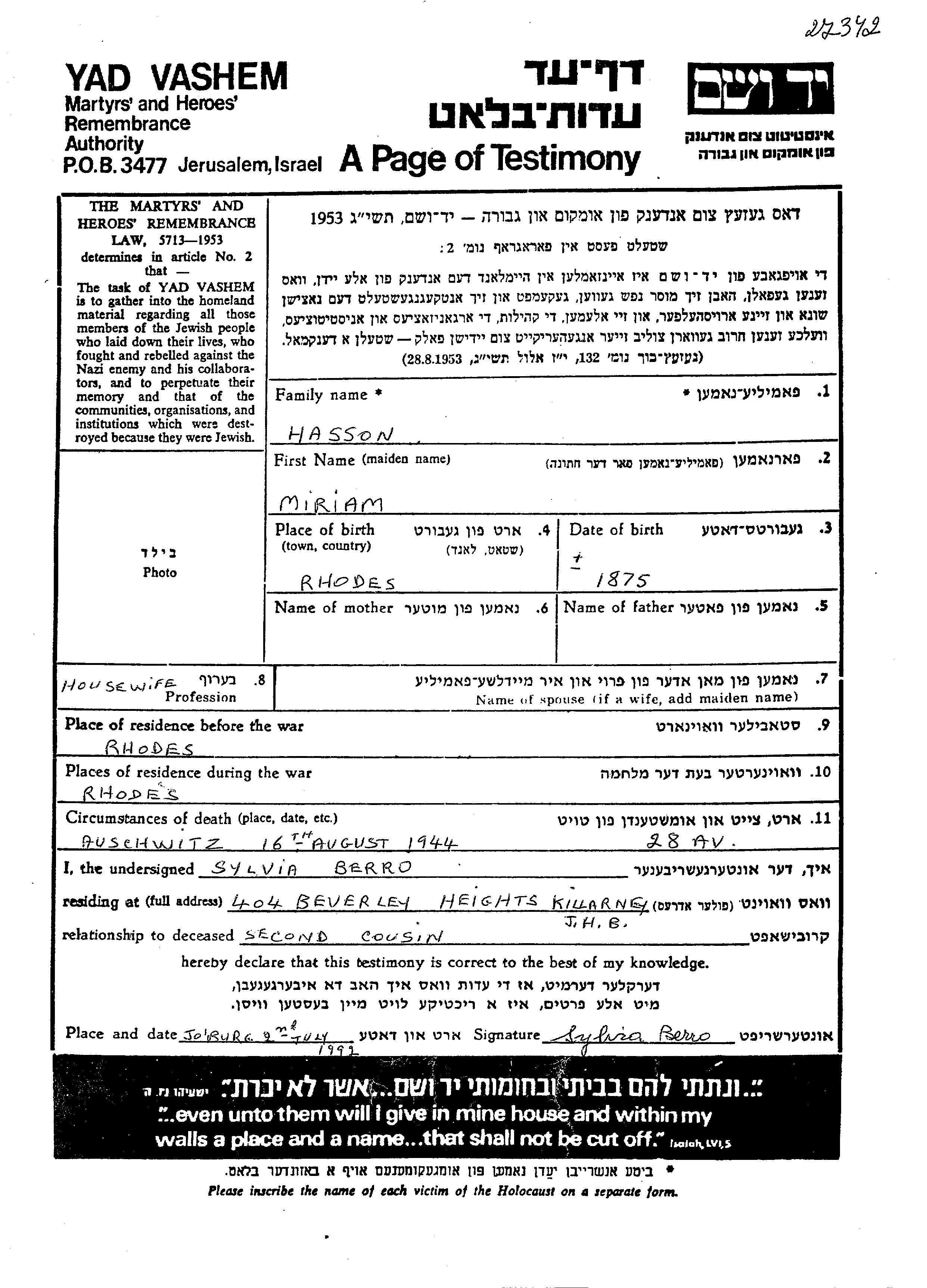 מרים Hasson נולדה בRhodes שבאיטליה בשנת 1875. היא היתה עקרת בית. לפני מלחמת העולם השניה התגוררה בRhodes שבאיטליה. בזמן המלחמה היא היתה בRhodes שבאיטליה.