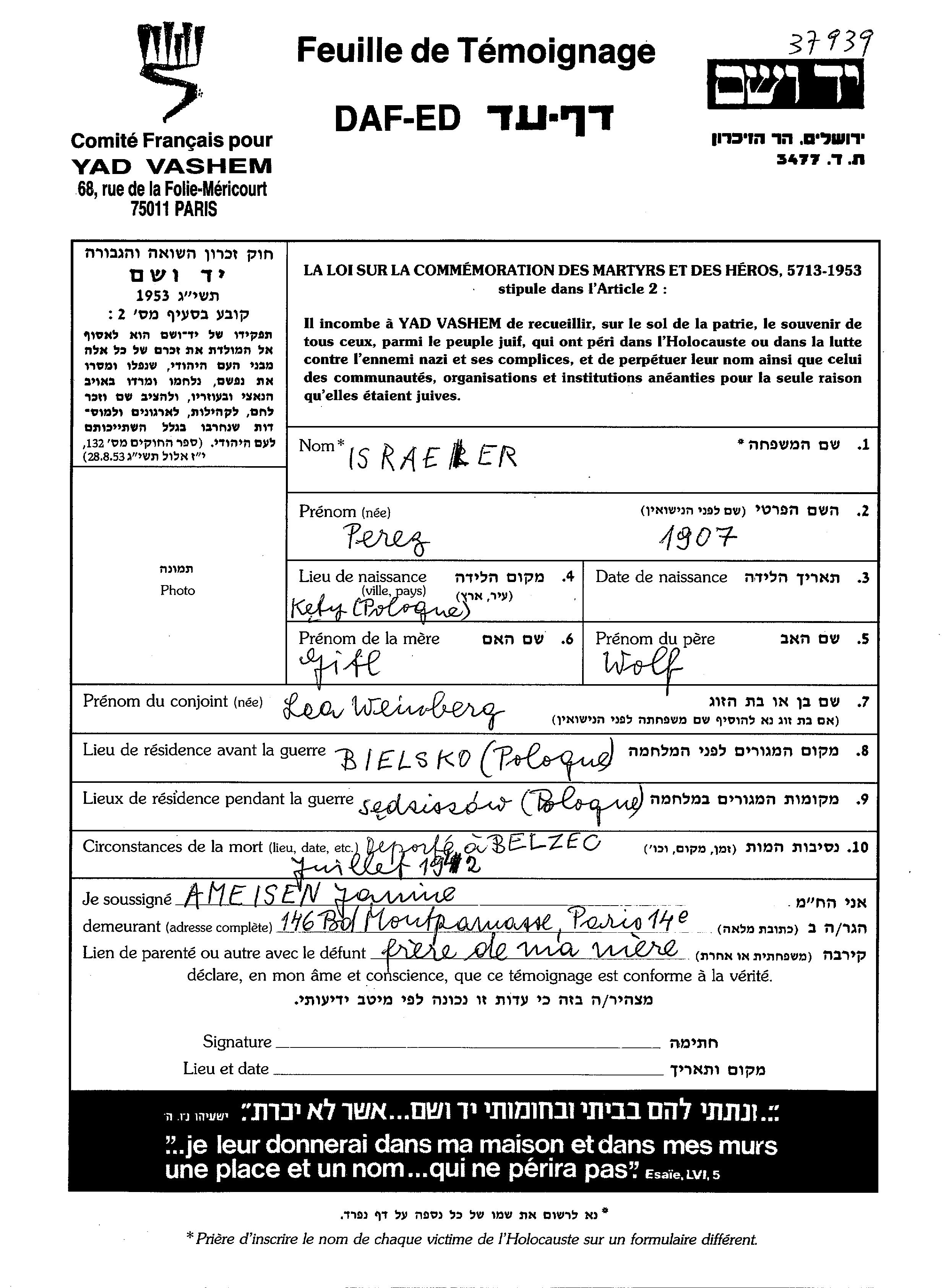 Perez ישראלר נולד בKety שבפולין בשנת 1907 לWolf וGitl. הוא היה נשוי ללאה. לפני מלחמת העולם השניה התגורר בBielsko שבפולין. בזמן המלחמה הוא היה בSedziszow שבפולין. הוא נרצח בשואה. מקום המוות: Belzec שבפולין.
