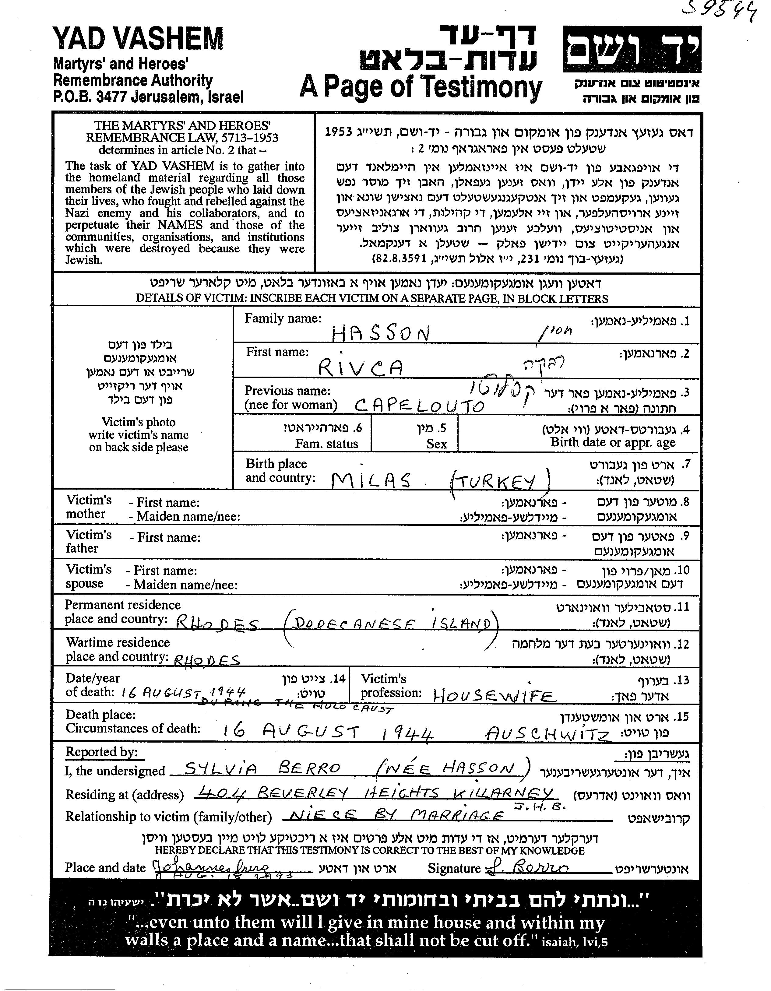 רבקה Hasson לבית Capelouto נולדה בMilas שבטורקיה. היא היתה עקרת בית. לפני מלחמת העולם השניה התגוררה בRhodes שבאיטליה. בזמן המלחמה היא היתה בRhodes שבאיטליה.