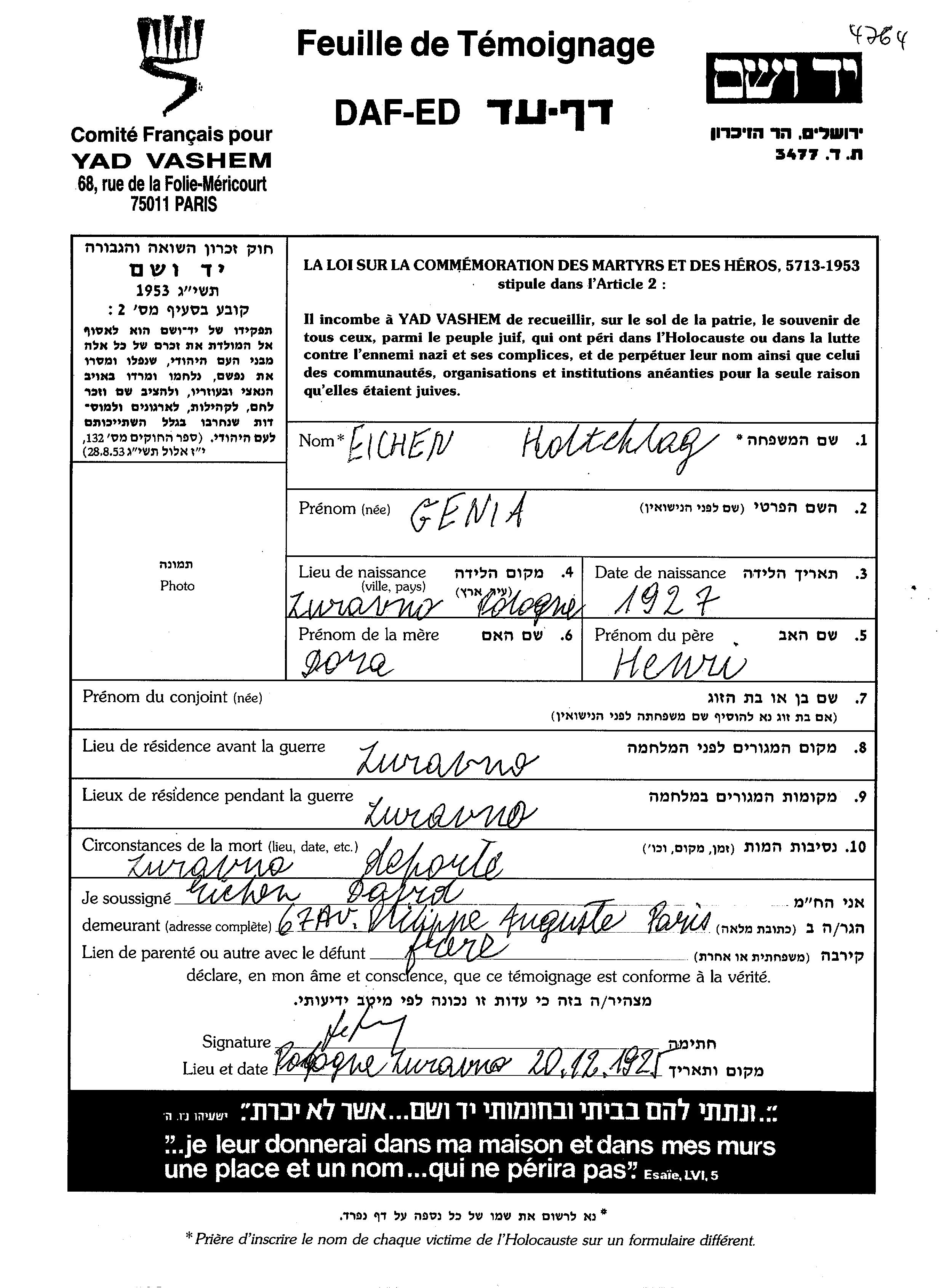 Genia Eichen Holtchlag נולדה בZurawno שבפולין בשנת 1927 לHenri הרמן ודורה לבית איידלר. היא היתה ילדה. לפני מלחמת העולם השניה התגוררה בZurawno שבפולין. בזמן המלחמה היא היתה בZurawno שבפולין. היא נרצחה בשואה.