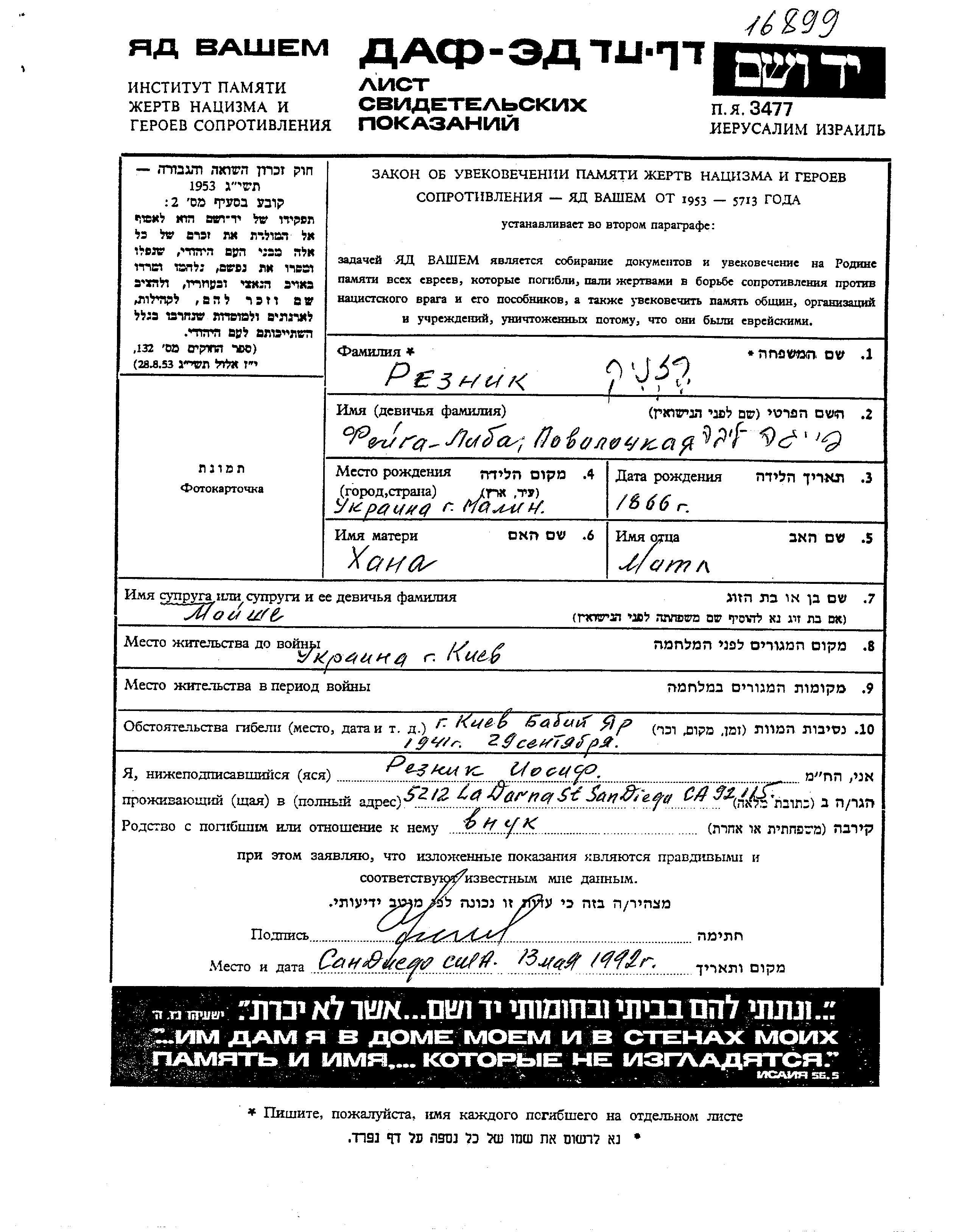 פייגה ליבה רזניק לבית פובולוצקי נולדה בMalin שבאוקראינה (ברה"מ) בשנת 1866 לMotl וחנה. היא היתה נשואה לMoishe. לפני מלחמת העולם השניה התגוררה בKiyev שבאוקראינה (ברה"מ). בזמן המלחמה היא היתה בKiyev שבאוקראינה (ברה"מ).