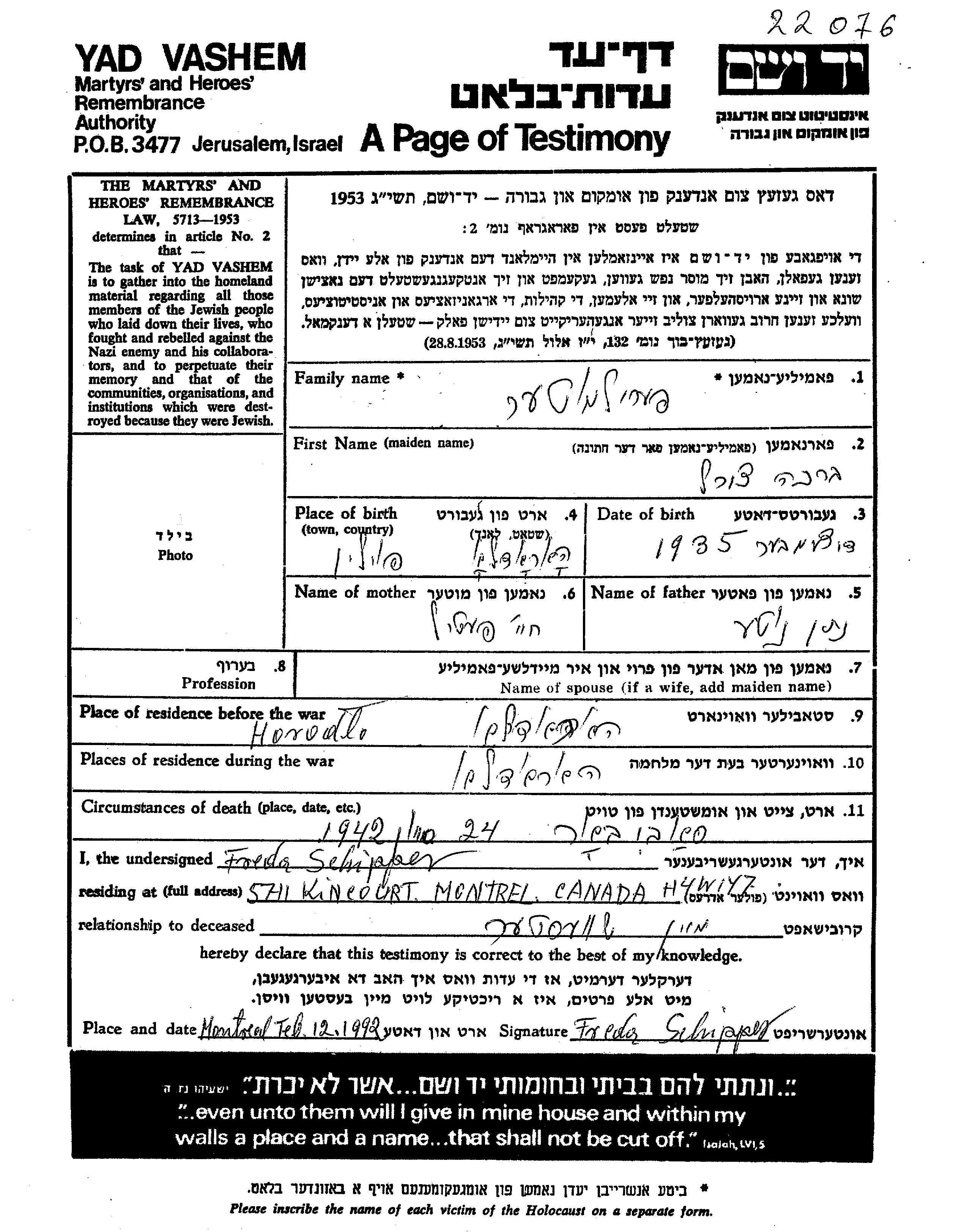 צירל ברכה פרלמוטר נולדה בHorodlo שבפולין בשנת 1935 לנתן נוטה וPetil חיה פטיל לבית Zavidovitch. היא היתה ילדה. לפני מלחמת העולם השניה התגוררה בHorodlo שבפולין. בזמן המלחמה היא היתה בHorodlo שבפולין. צירל ברכה נרצחה בשואה. מקום המוות: Sobibor שבפולין בשנת 09/06/1942.