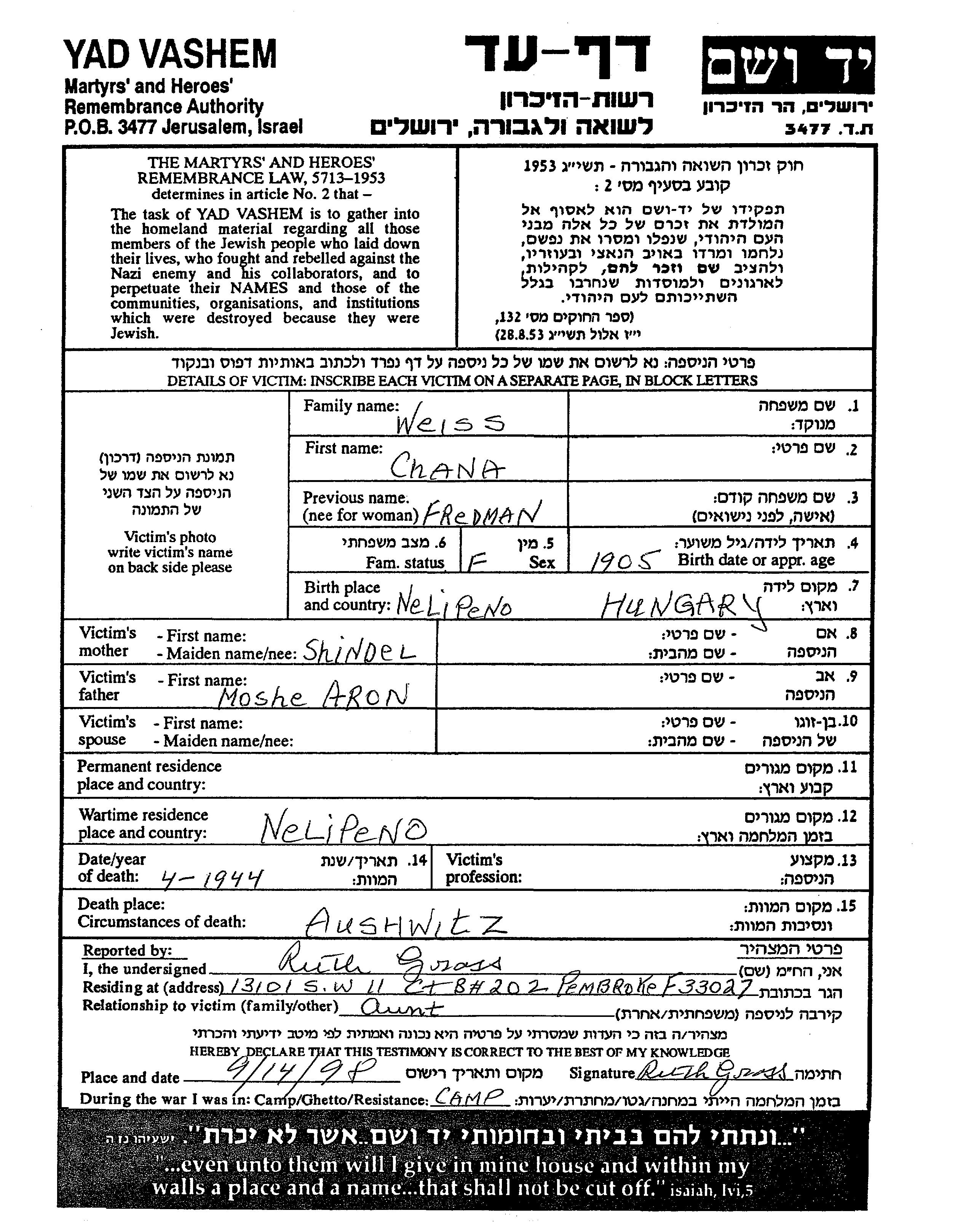 חנה Weiss לבית Fredman נולדה בNelipeno שבצ'כוסלובקיה בשנת 1905 למשה ארון ושינדל. בזמן המלחמה היא היתה בNelipeno שבצ'כוסלובקיה.