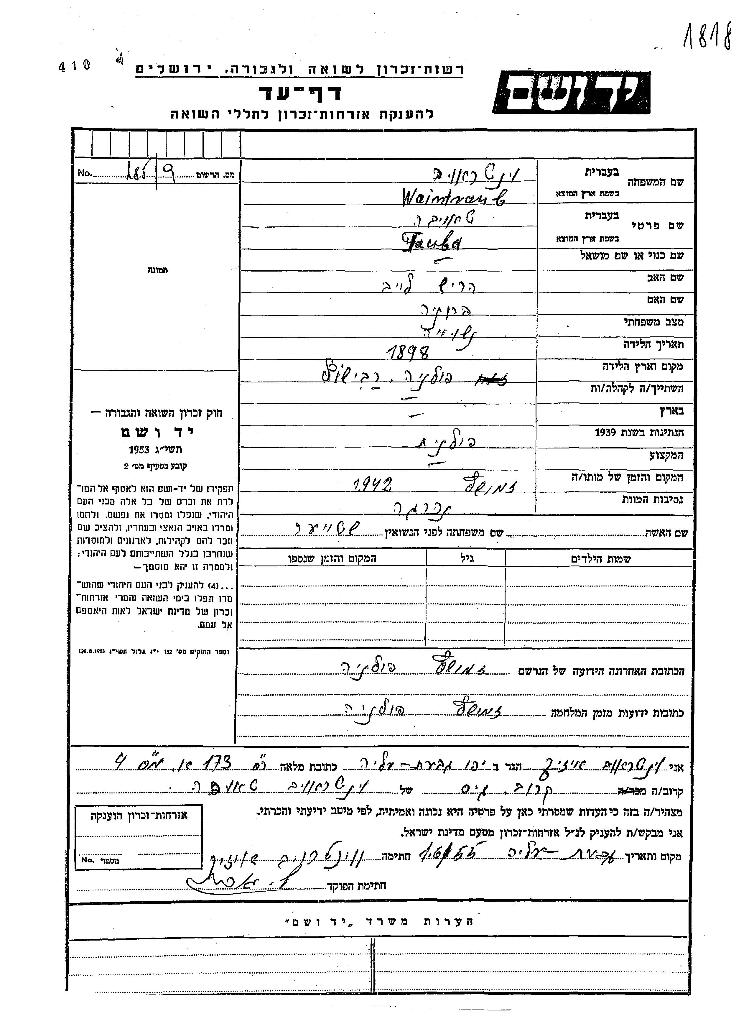 טאובה Waintraub נולדה בRabiszow שבפולין בשנת 1898 ללייב הרש וברוניה. היא היתה נשואה. לפני מלחמת העולם השניה התגוררה בZamoszcz שבפולין. בזמן המלחמה היא היתה בZamoszcz שבפולין. טאובה נרצחה בשואה. מקום המוות: Zamoszcz שבפולין בשנת 1942.