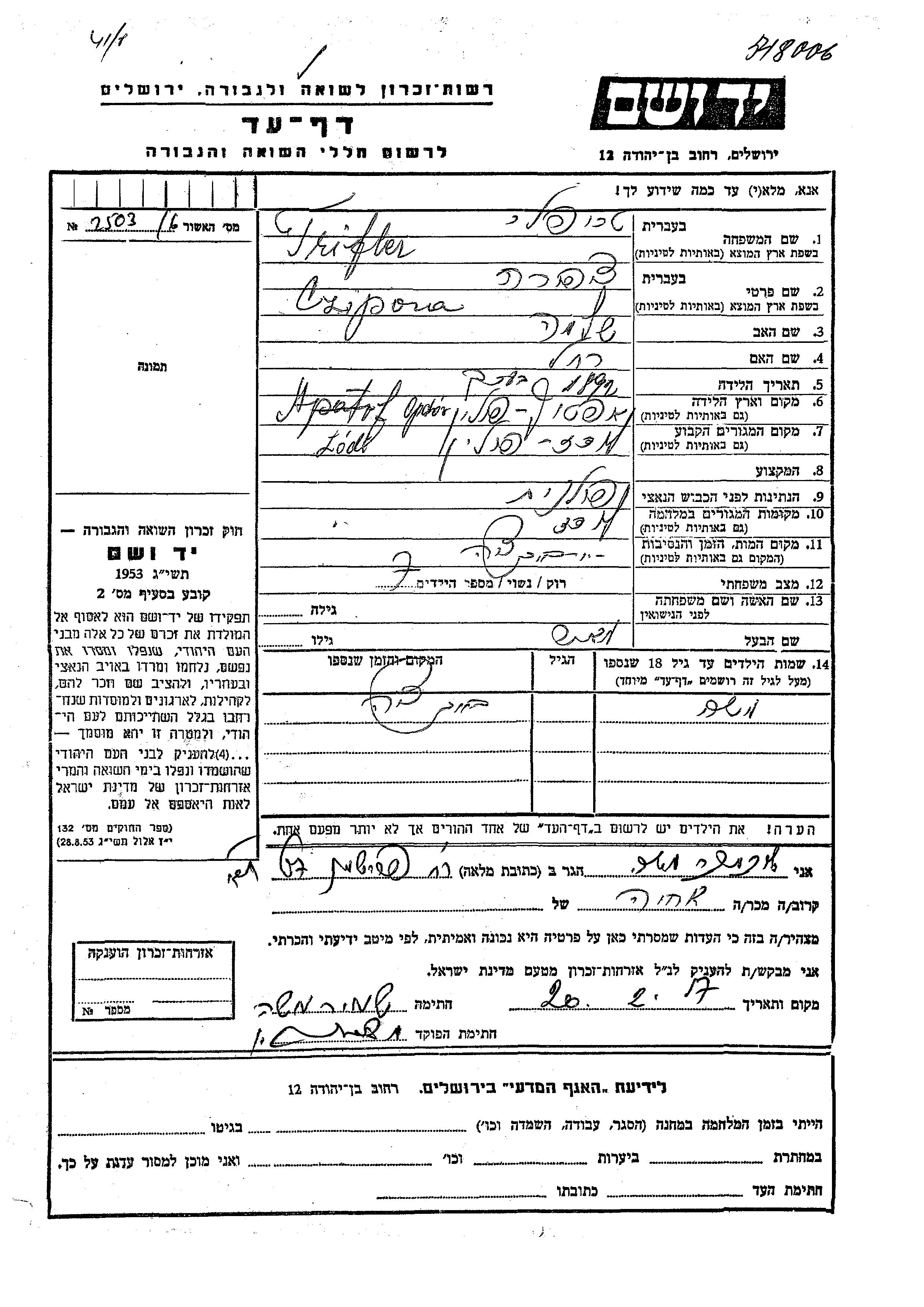 Czipora טריפלר נולדה בOpatow שבפולין בשנת 1892 לשלמה ורחל. היא היתה נשואה למאיר. לפני מלחמת העולם השניה התגוררה בLodz שבפולין. בזמן המלחמה היא היתה בLodz שבפולין. היא נרצחה בשואה. מקום המוות: Lodz שבפולין.