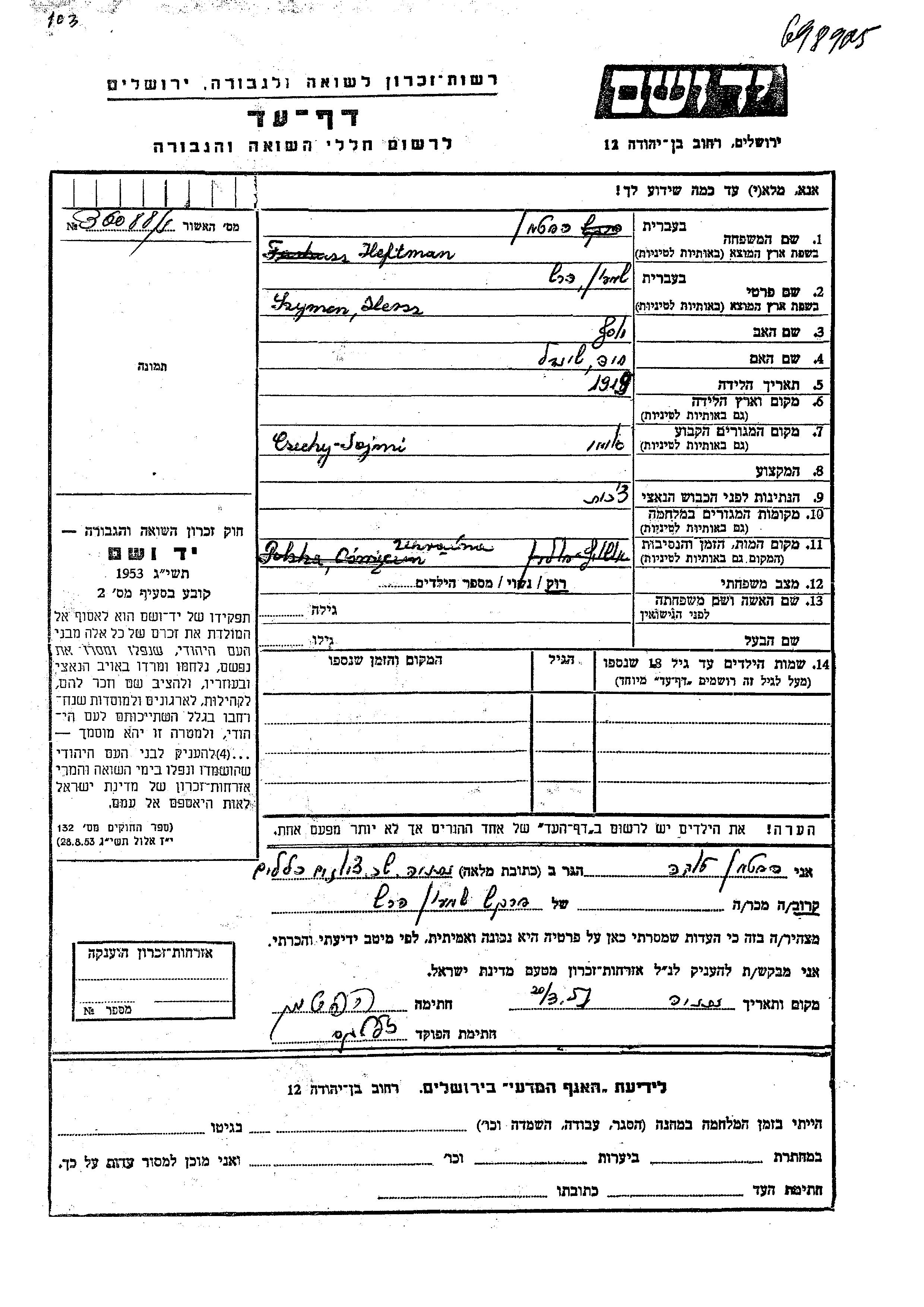 Szymon Hersz הפטמן נולד בשנת 1919 ליוסף וחיה שינדל. הוא היה רווק. לפני מלחמת העולם השניה התגורר בSojmi. הוא נרצח בשואה. מקום המוות: Undeciphered Place שבאוקראינה (ברה"מ).