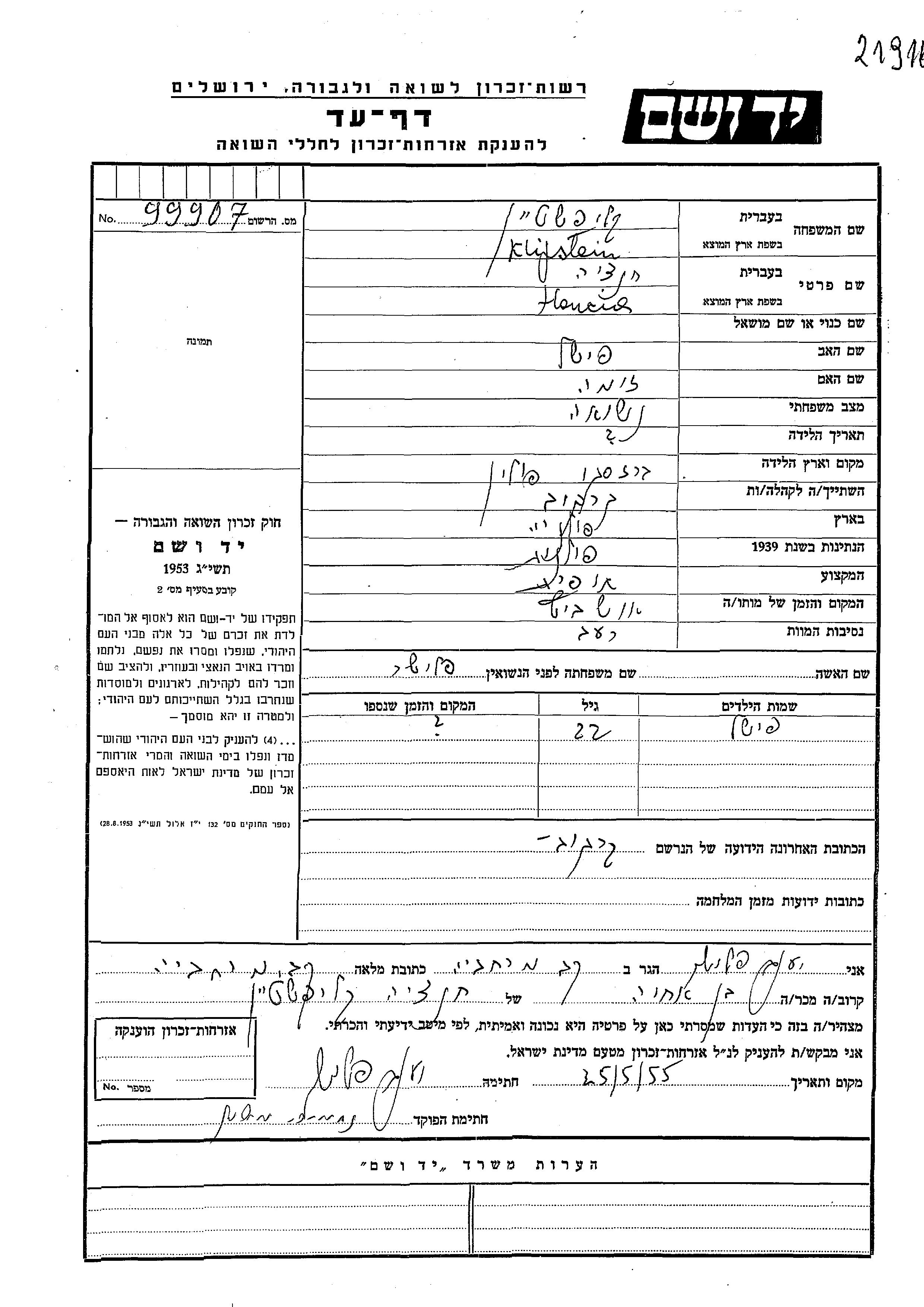 Hancia Klifstein לבית פלישר נולדה בBrzesko שבפולין לפישל וזימה. היא היתה תופרת ונשואה. לפני מלחמת העולם השניה התגוררה בKrakow שבפולין. היא נרצחה בשואה. מקום המוות: Auschwitz שבפולין.