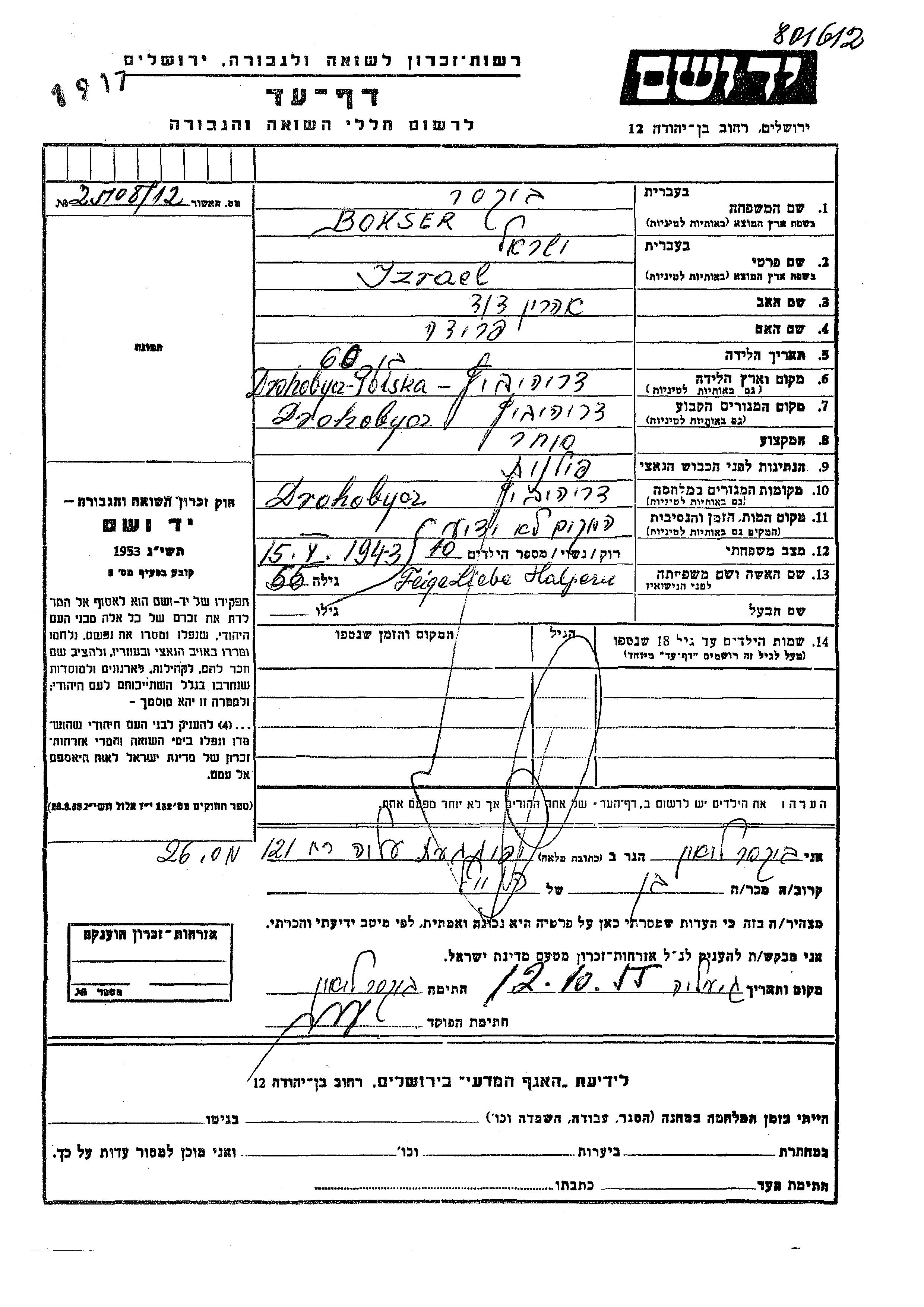 ישראל בוקסר נולד בDrohobycz שבפולין לאהרן דוד ופרידה. הוא היה סוחר ונשוי לפייגה Liebe לבית הלפרן. לפני מלחמת העולם השניה התגורר בDrohobycz שבפולין. בזמן המלחמה הוא היה בDrohobycz שבפולין. ישראל נרצח בשואה. מקום המוות: לא ידוע בשנת 1943.