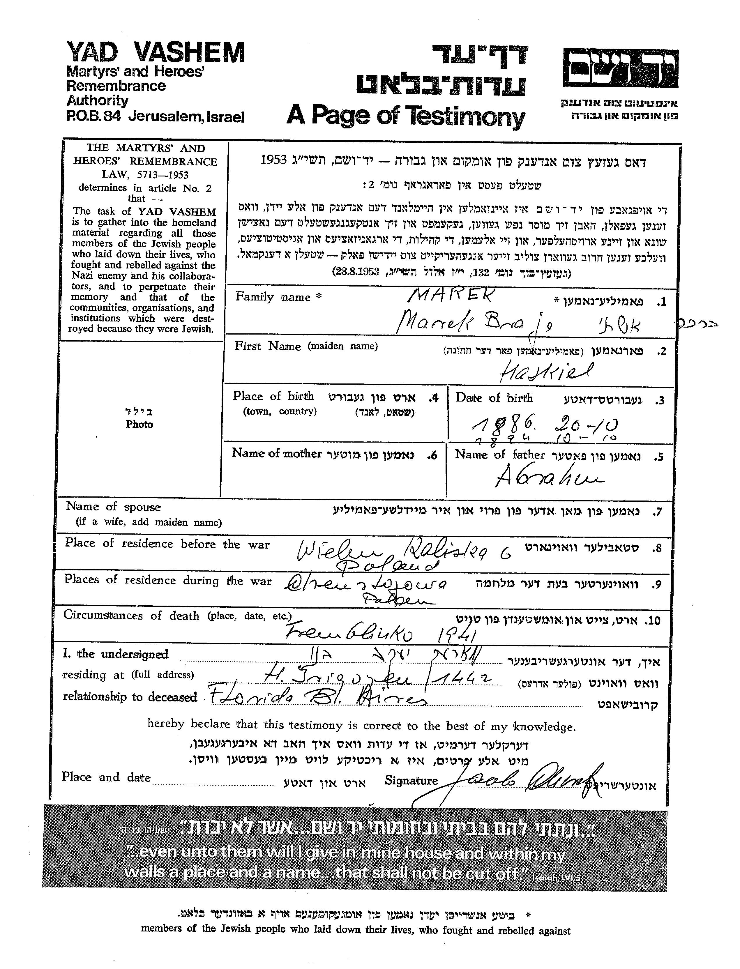 Haskiel Marek נולד בשנת 1886 לAbraham. לפני מלחמת העולם השניה התגורר בWielun שבפולין.