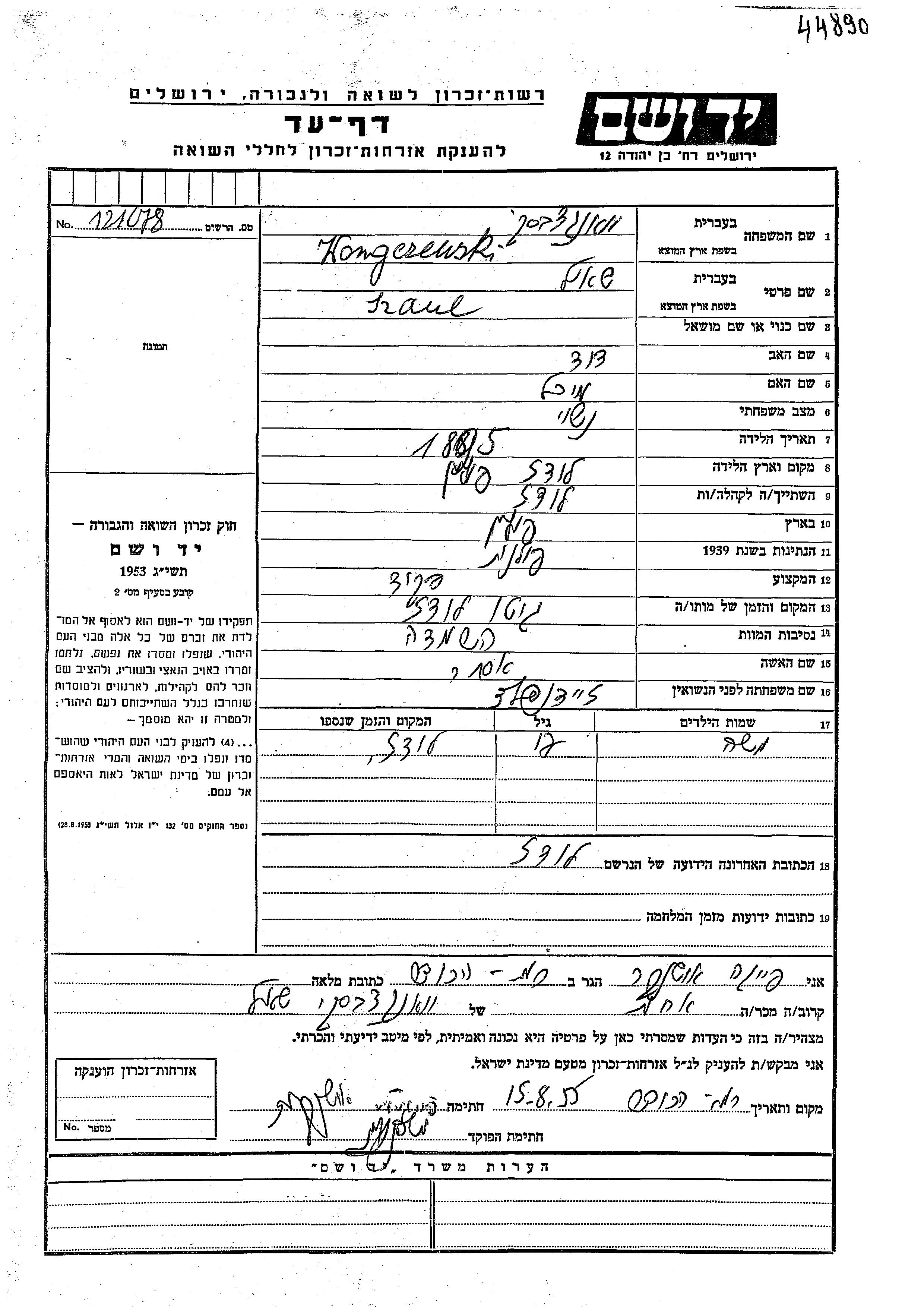 Szaul Wongczewski נולד בLodz שבפולין בשנת 1895 לדוד ומירל. הוא היה פקיד ונשוי לאסתר לבית זיידנפלד. לפני מלחמת העולם השניה התגורר בLodz שבפולין. בזמן המלחמה הוא היה בLodz שבפולין. הוא נרצח בשואה. מקום המוות: Lodz שבפולין.